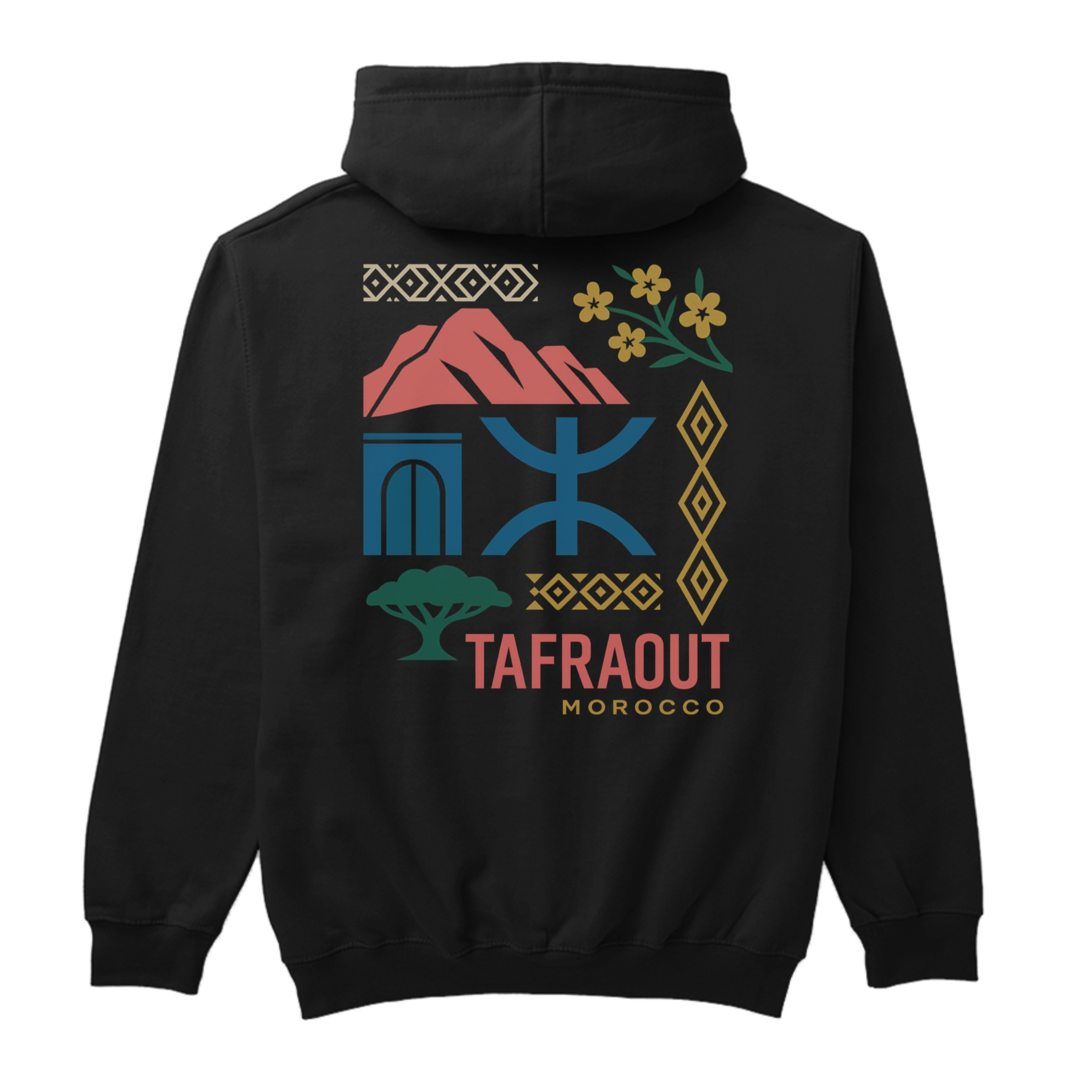 Un hoodie qui illumine vos tenues. Inspiré des paysages et symboles de Tafraout, ce design joue avec les couleurs et la lumière pour offrir une interprétation moderne de la culture amazighe.
