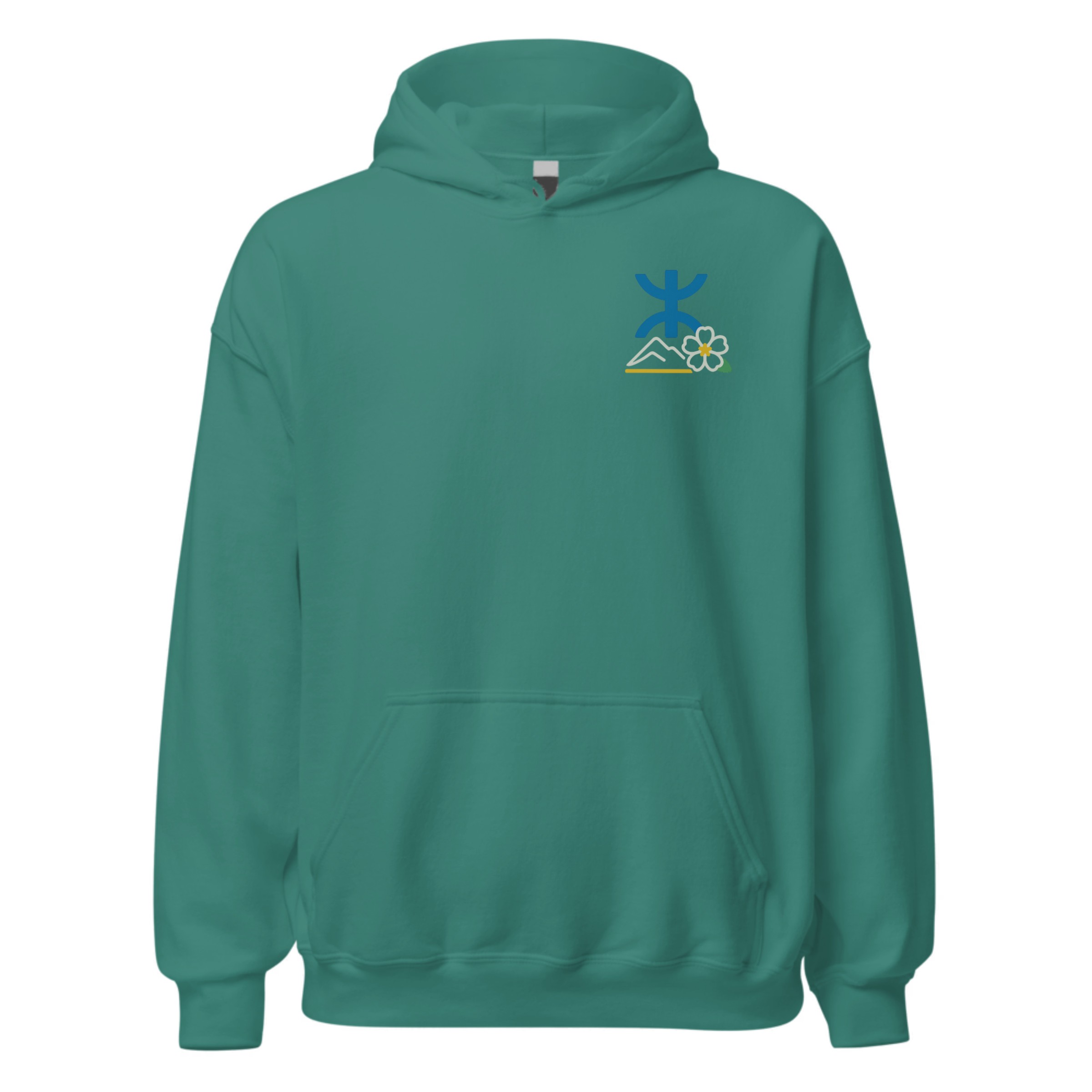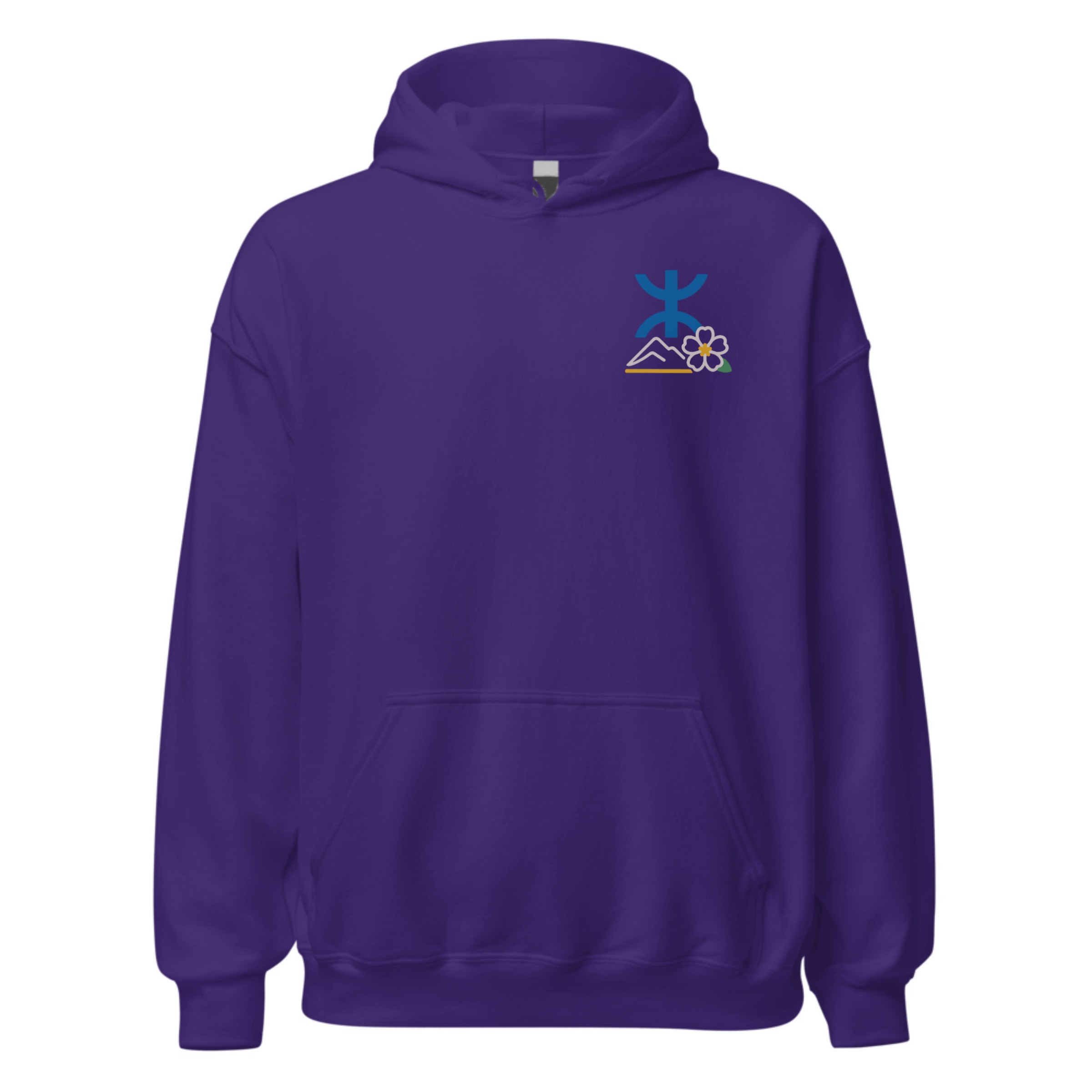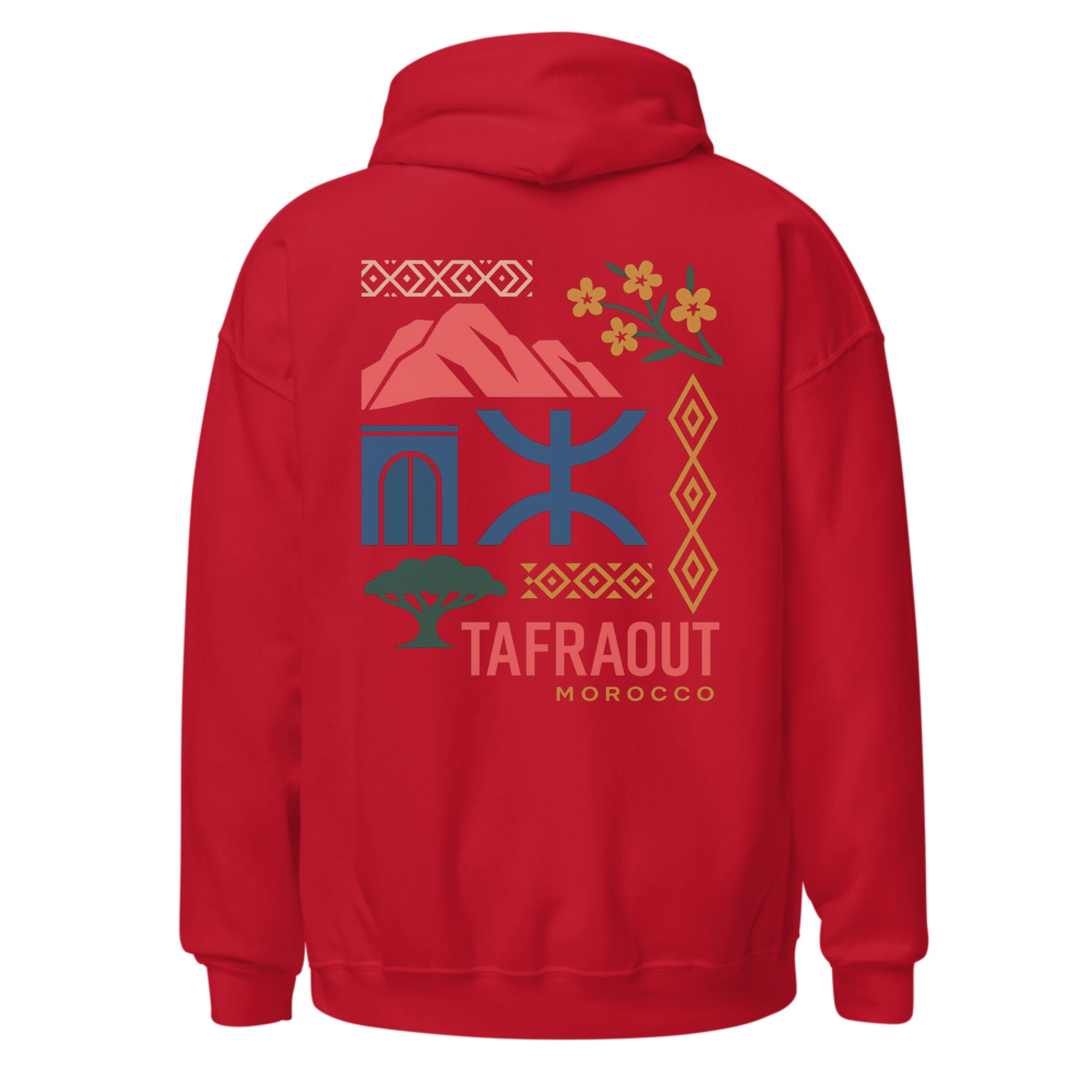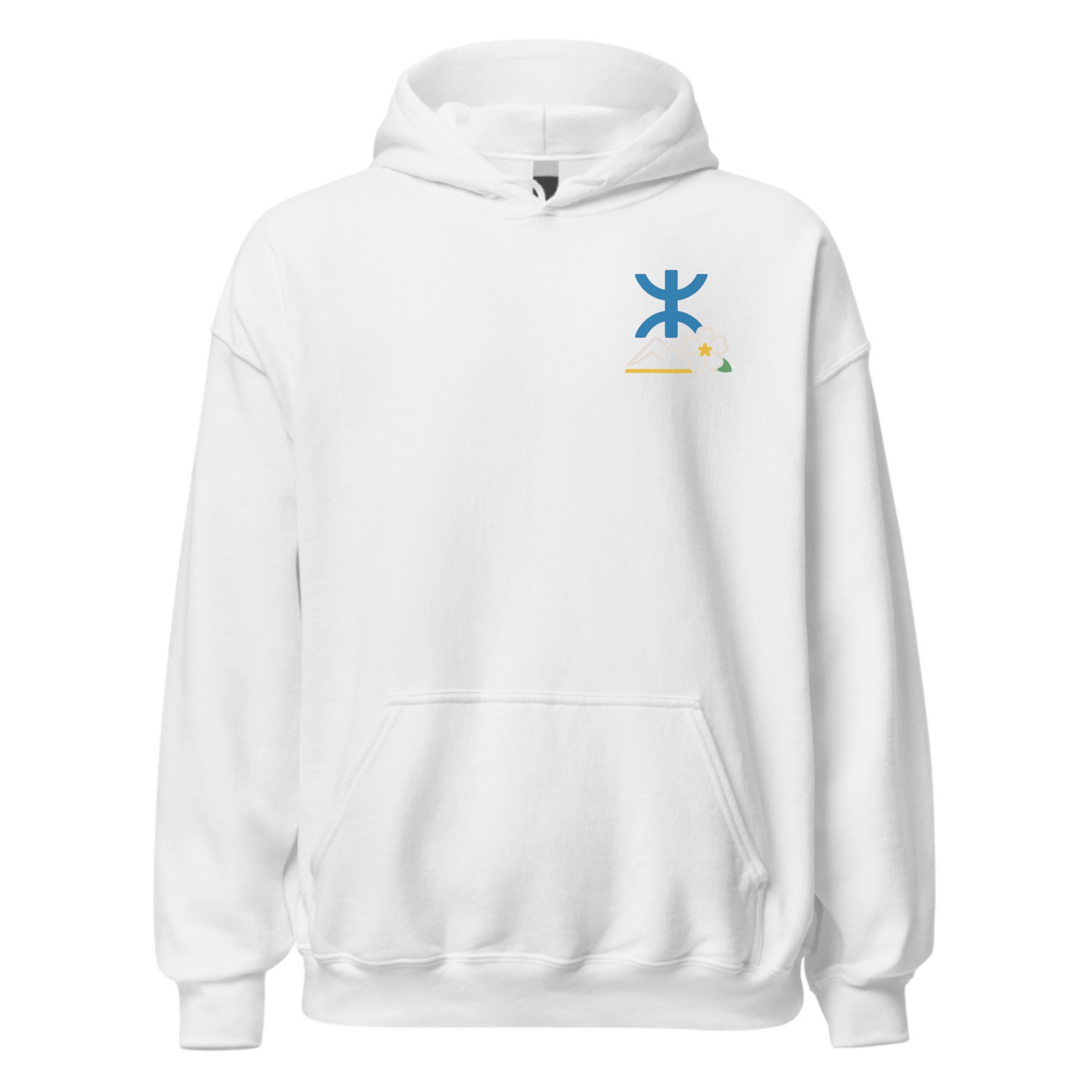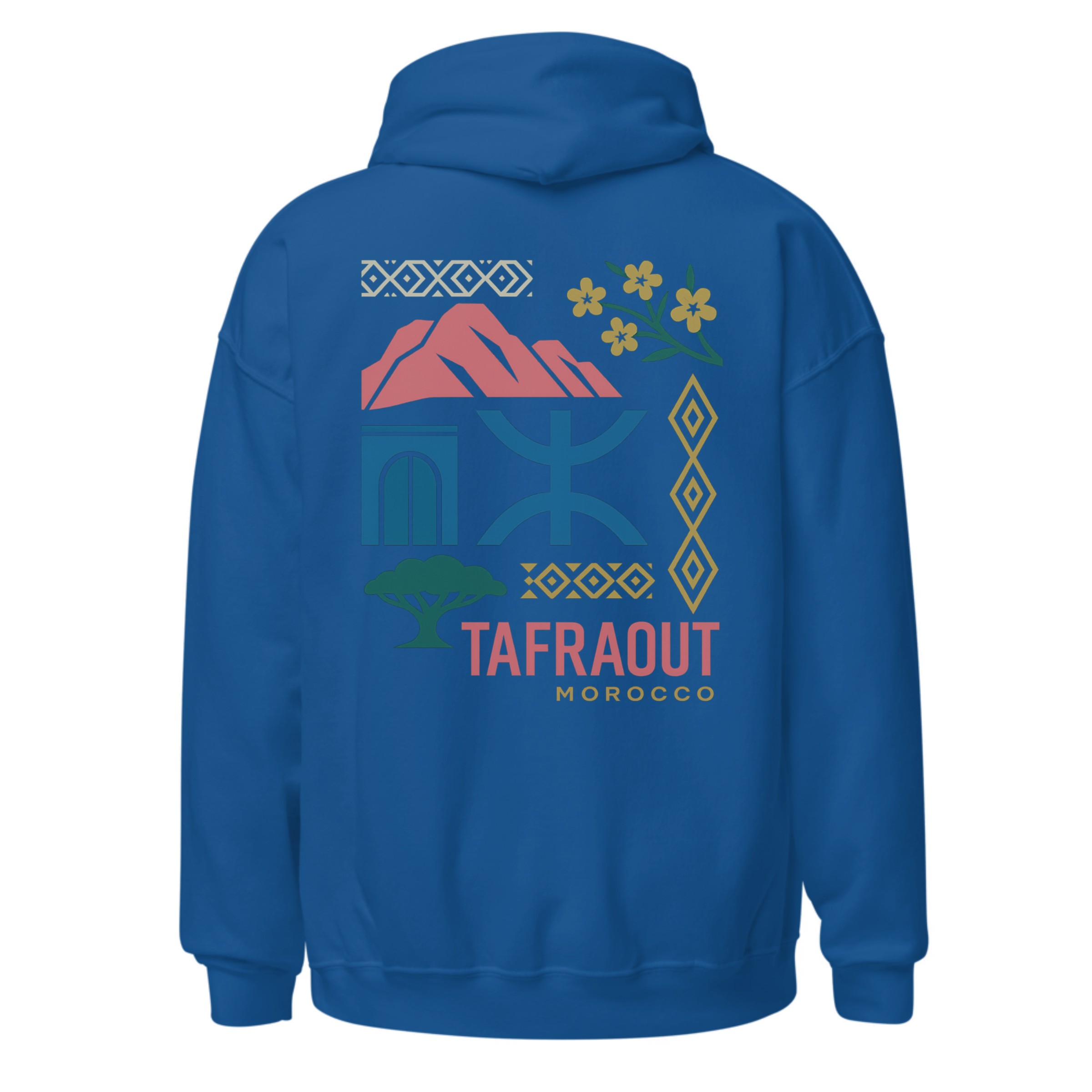 Hoodie oversize mixte 320 g en coton doux (80 % coton, 20 % polyester). Coupe ample streetwear, design Tafraout (montagnes, symboles amazighs, fleurs d’amandier). Poche kangourou et capuche ajustable. Finitions premium (molleton invisible, coutures renforcées). Une pièce qui affirme vos racines et votre style.