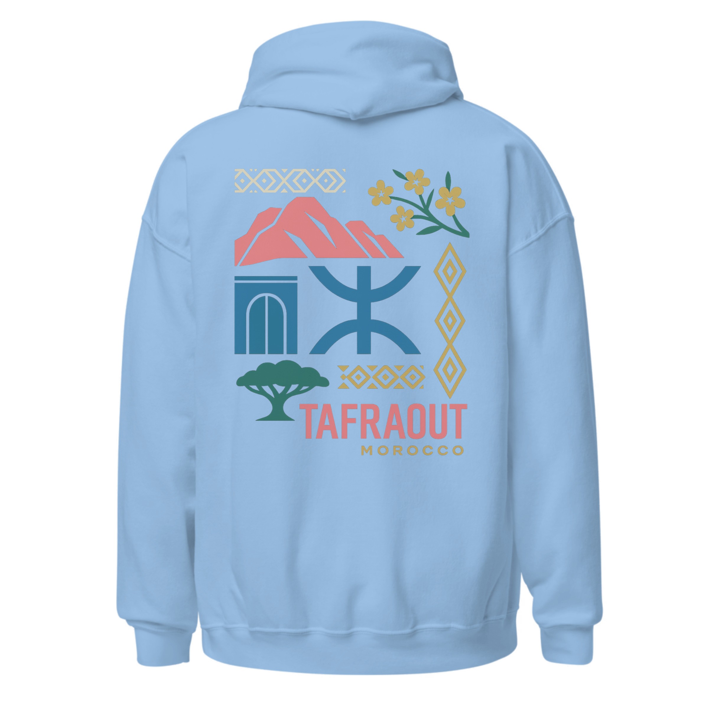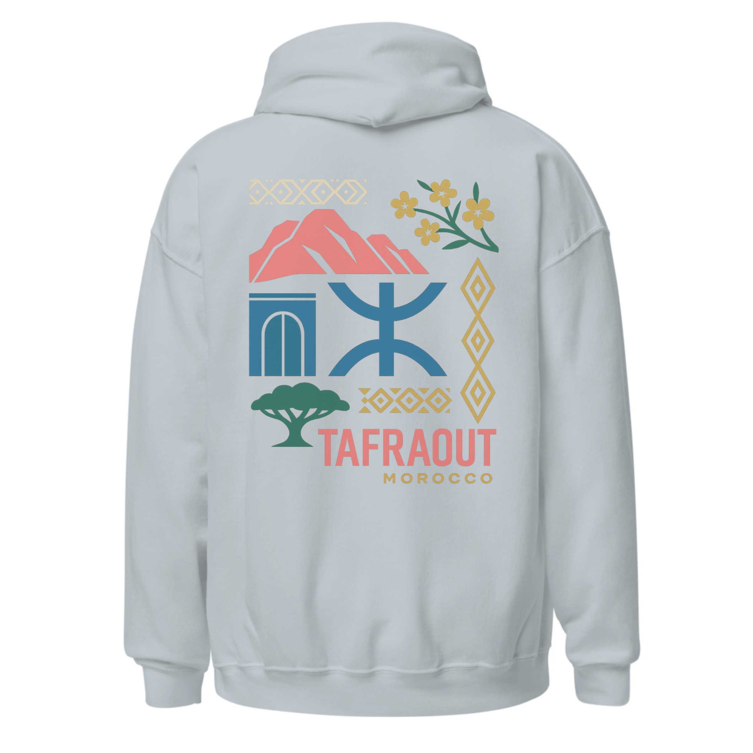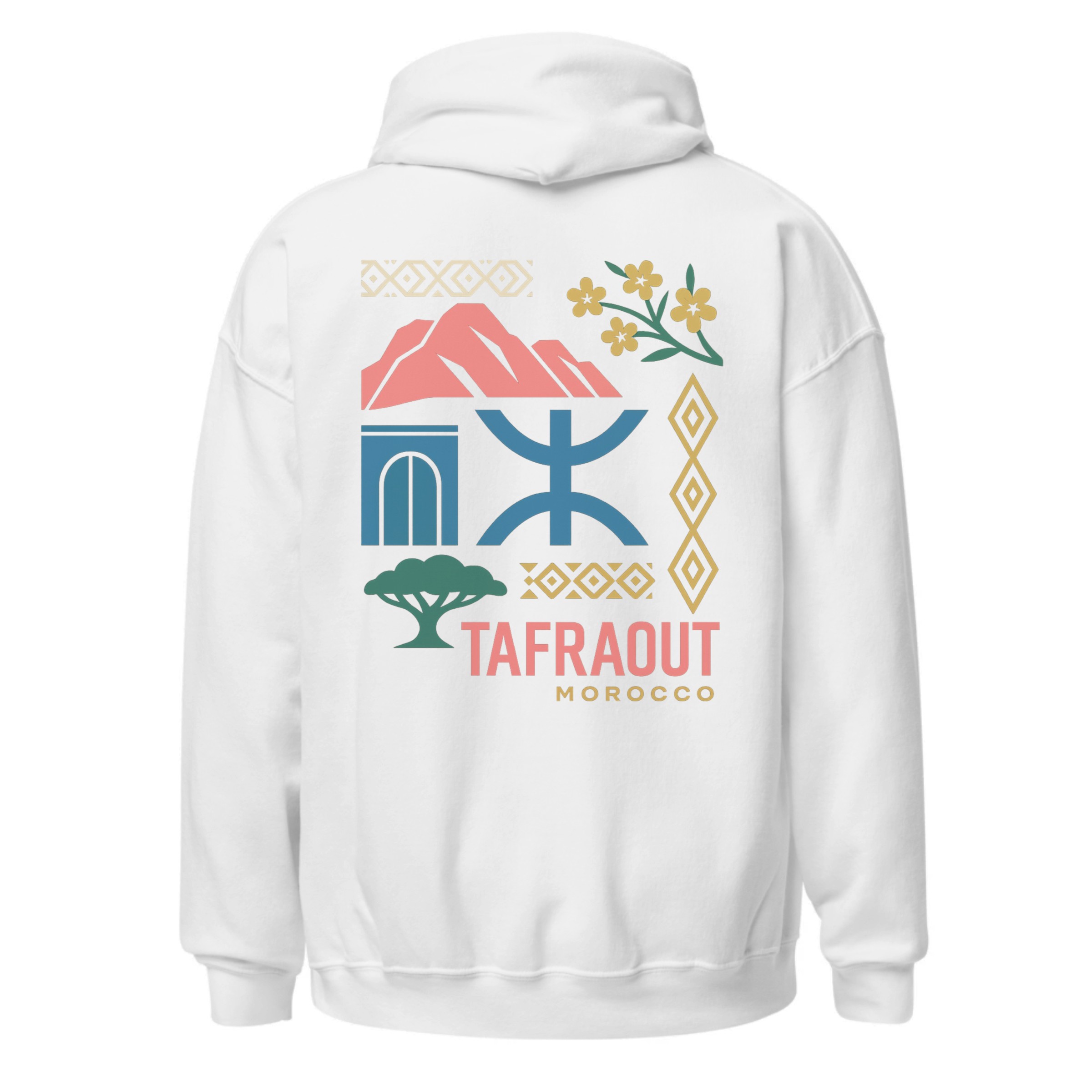 Un oversize hoodie qui illumine vos tenues. Inspiré des paysages et symboles de Tafraout, ce design joue avec les couleurs et la lumière pour offrir une interprétation moderne de la culture amazighe.