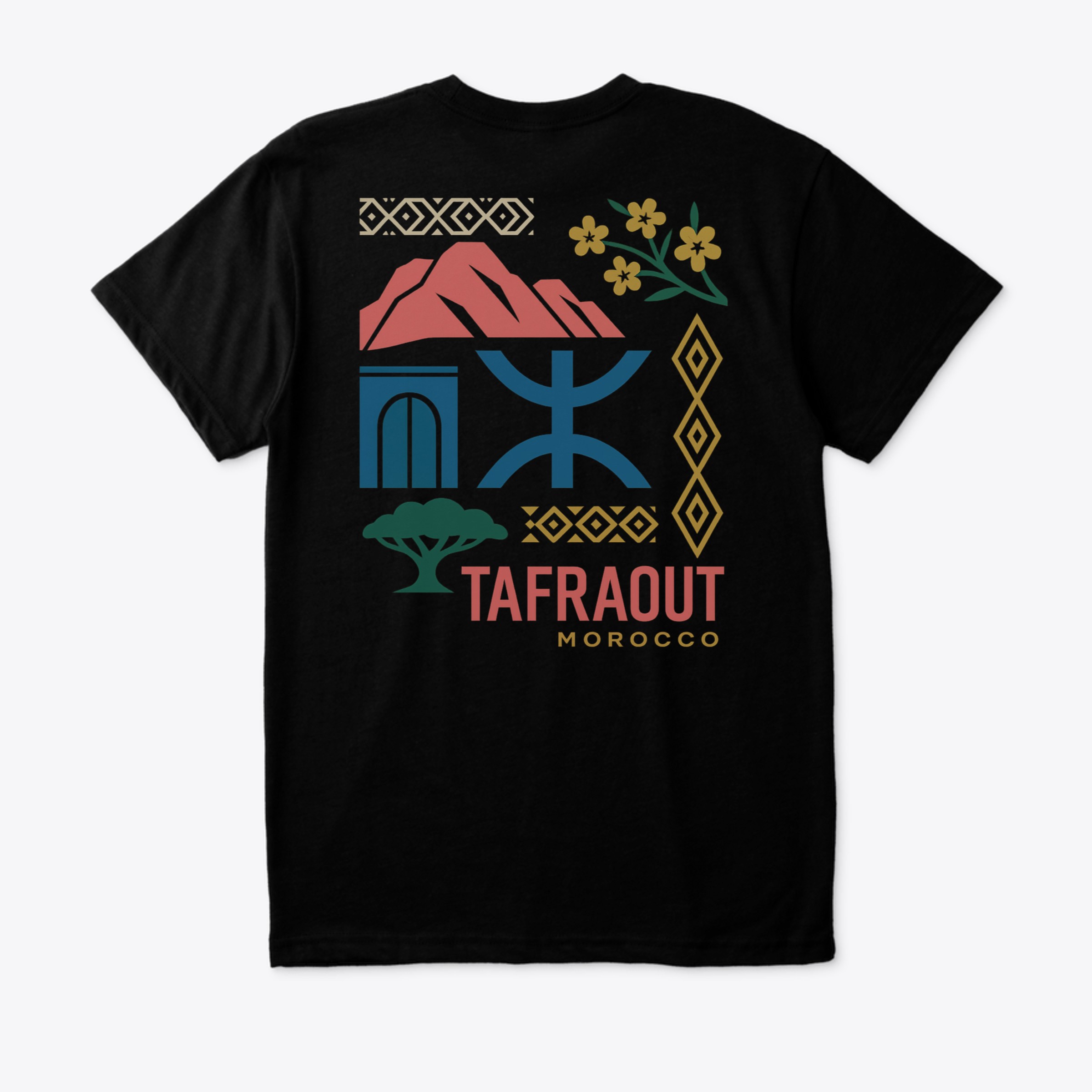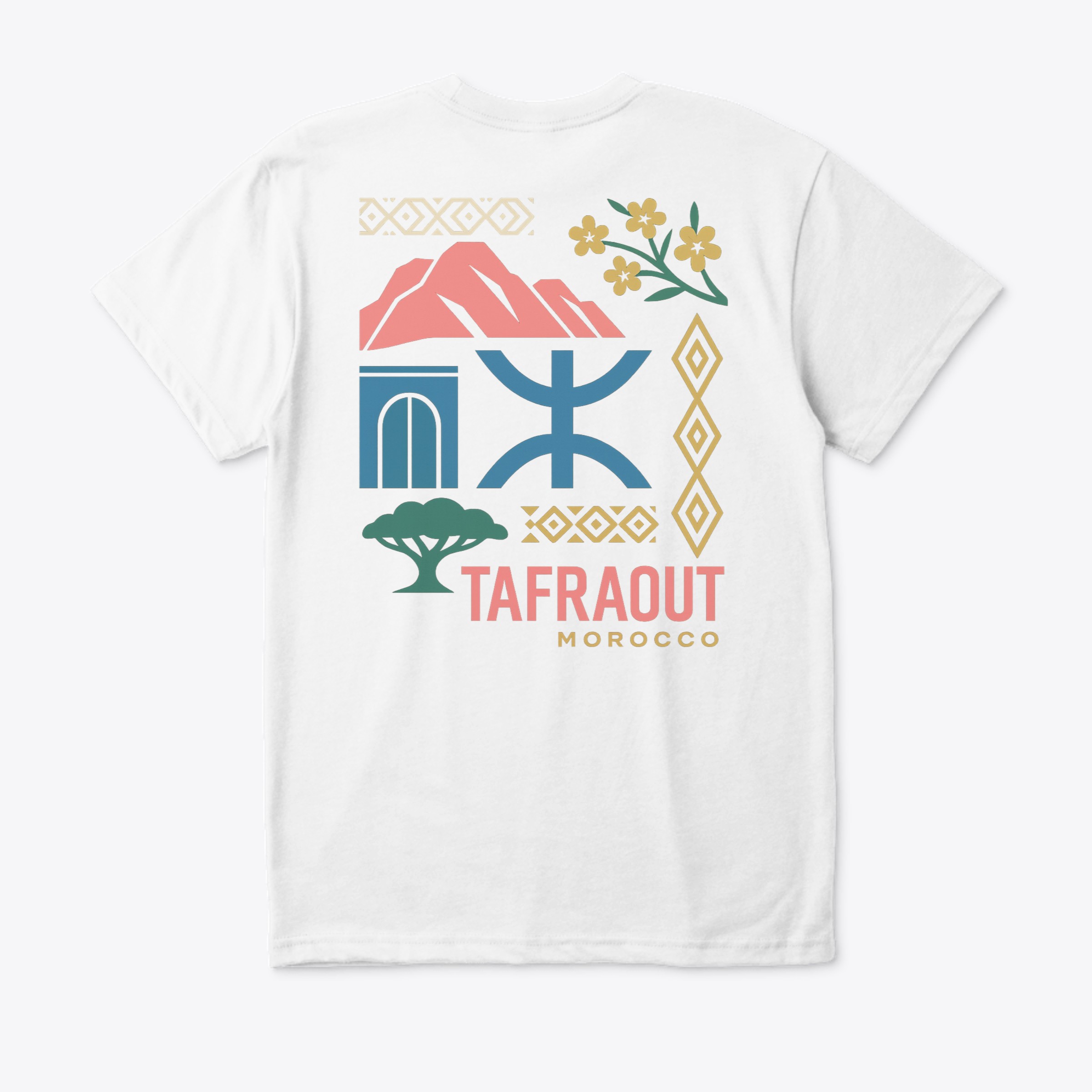 Un t-shirt lumineux, qui met en avant le symbole amazigh et les fleurs de “timizar”. Minimaliste et expressif, il capture l’essence de Tafraout dans un style contemporain.