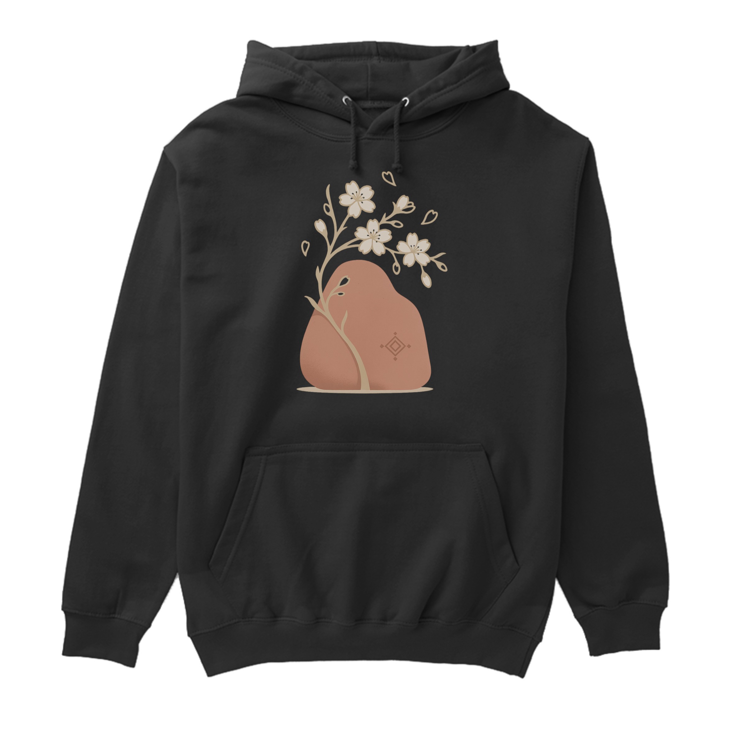Un hoodie qui incarne la poésie de Tafraout. La pierre ocre se transforme en écrin d’où naît la fleur “timizar”, symbole de vie et de beauté.