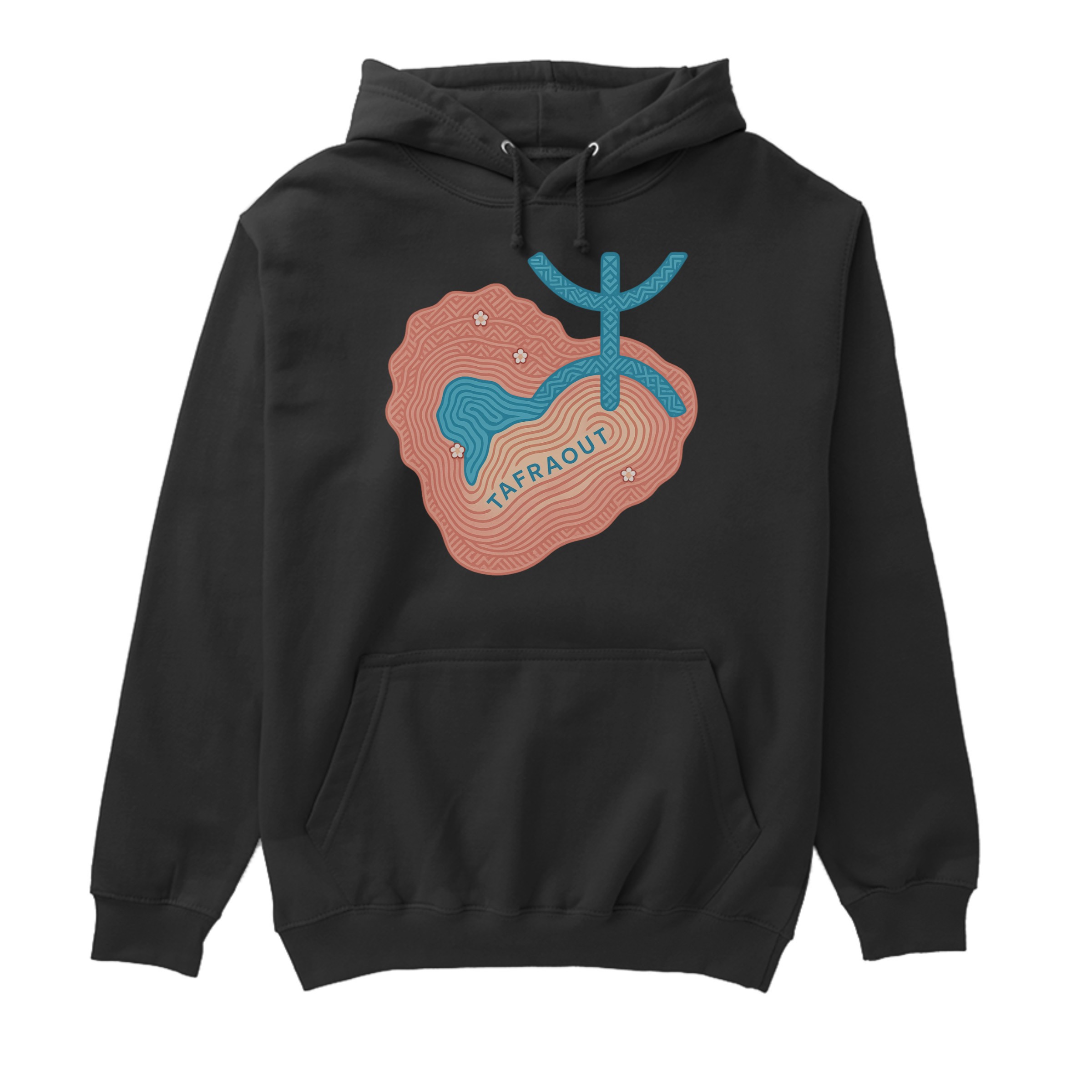 Ce hoodie est une carte vivante de Tafraout. Entre lignes topographiques, symbole amazigh et fleurs “timizar”, il illustre la richesse culturelle et géographique du Sud marocain.