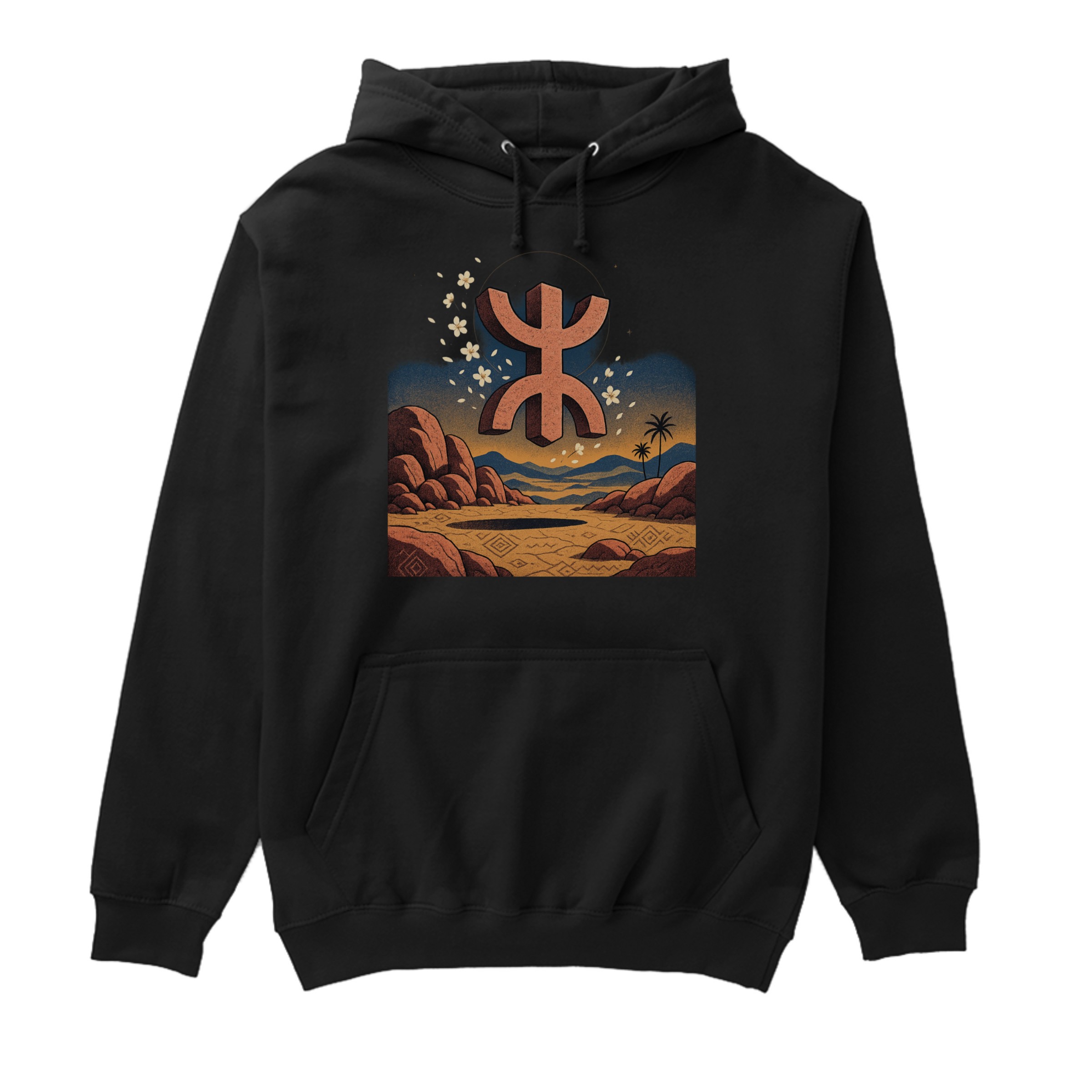 Un hoodie qui incarne la force et la douceur à la fois. Le symbole amazigh, sculpté comme dans la pierre, flotte au-dessus des montagnes de Tafraout, entouré de fleurs “timizar”.