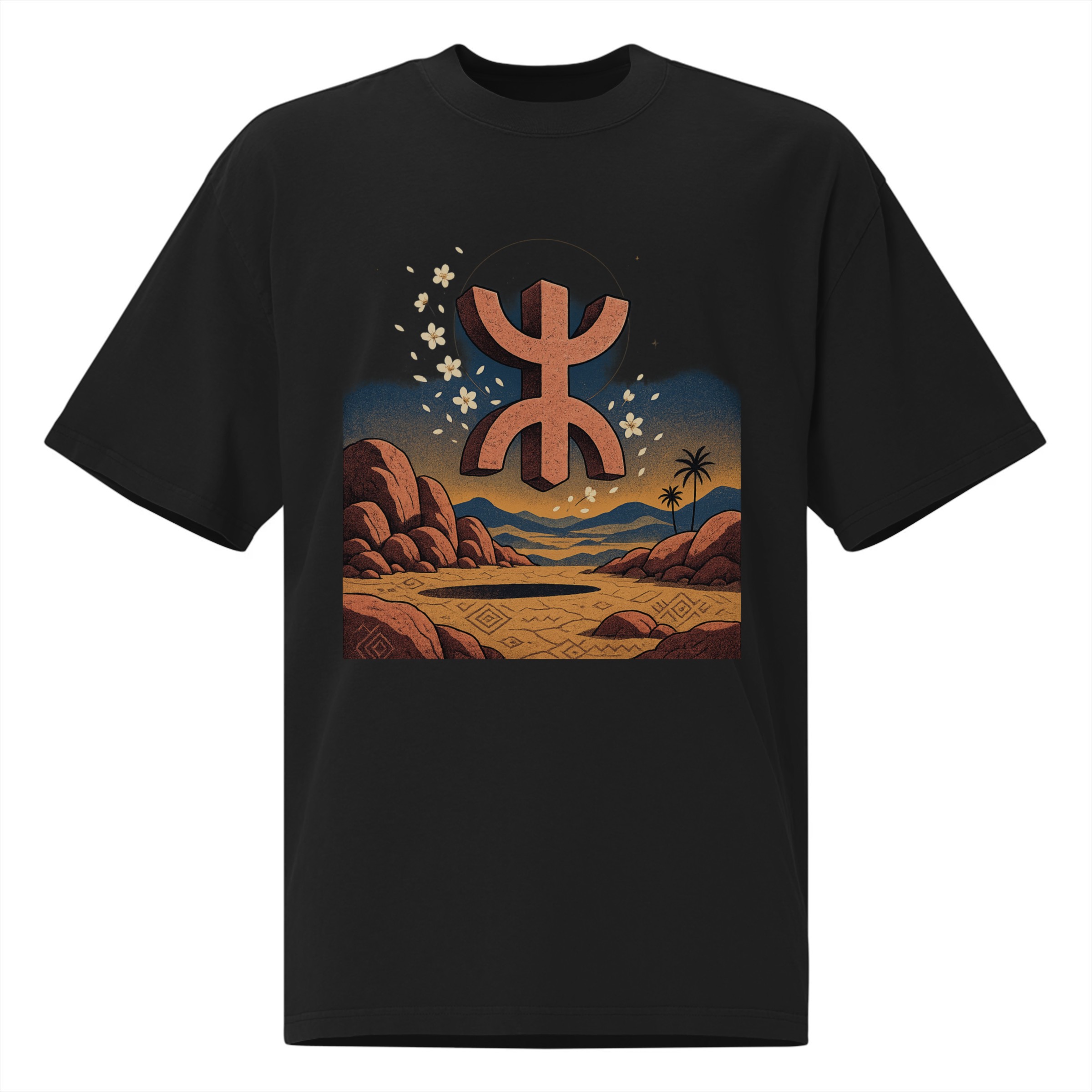 Pensé pour un style streetwear affirmé, ce t-shirt oversize affiche un design monumental. Le symbole amazigh en pierre, entouré de nature et de traditions, en fait une pièce forte et iconique.