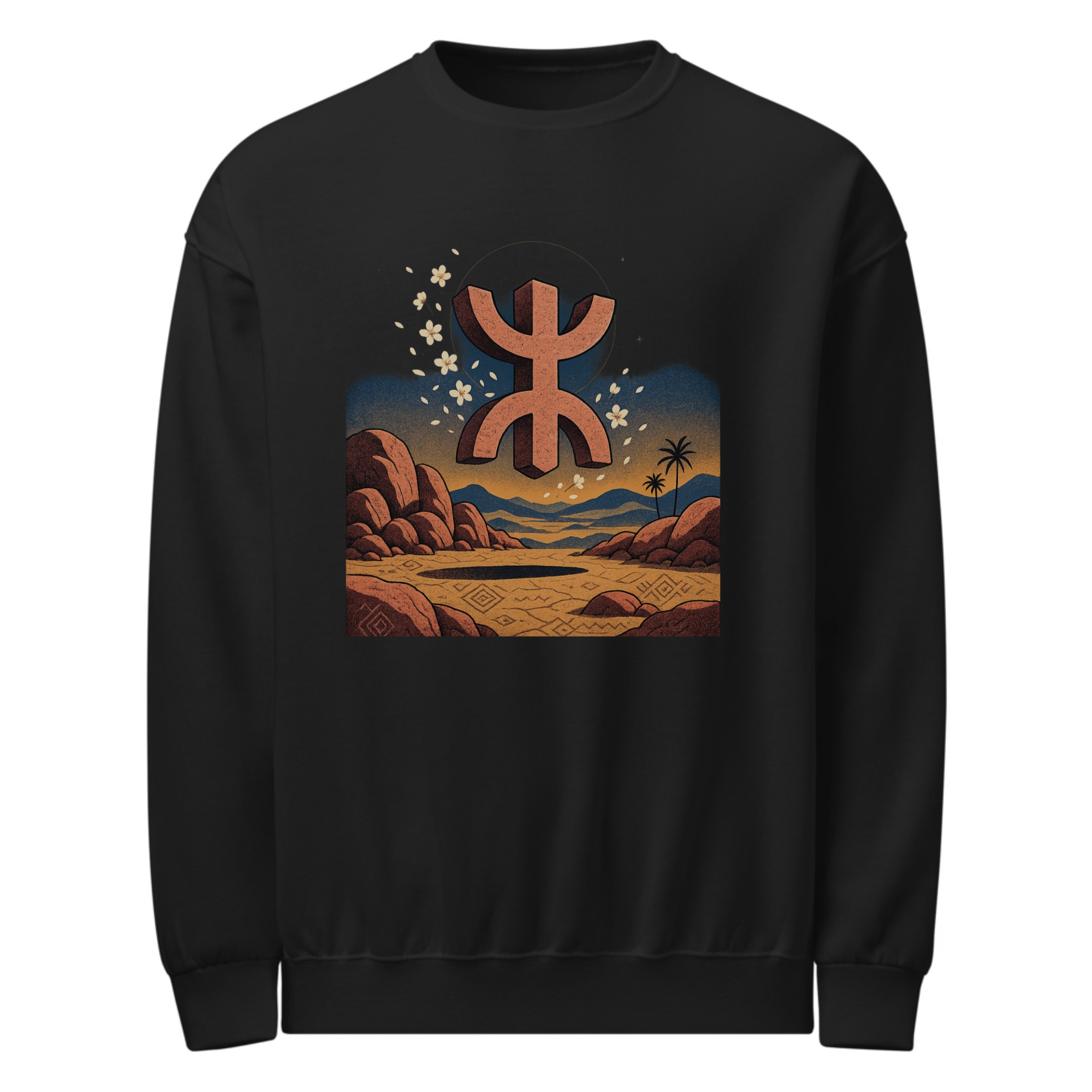 Ce sweatshirt est une ode à l’identité amazighe. Le symbole massif domine le désert, rappelant la solidité des racines, tandis que les fleurs d’amandiers apportent une touche de poésie.