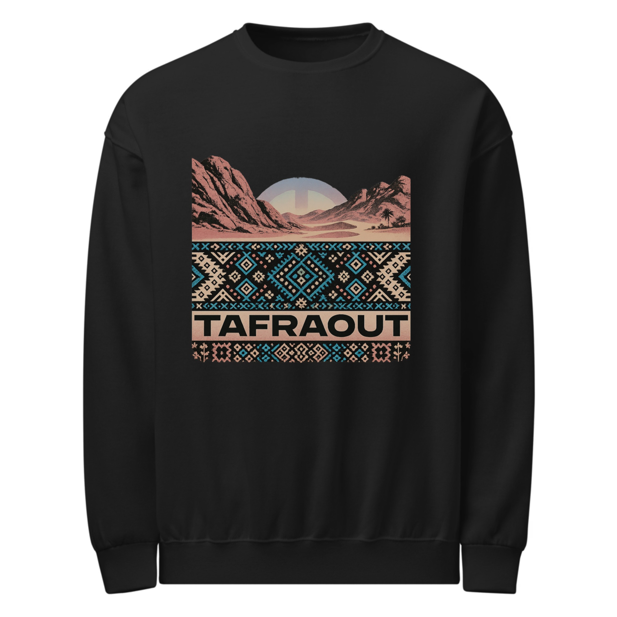 Ce sweatshirt incarne l’héritage de Tafraout. Les motifs traditionnels bleus et noirs rappellent les tapis berbères, tandis que les montagnes et le symbole amazigh projettent une identité forte et intemporelle.