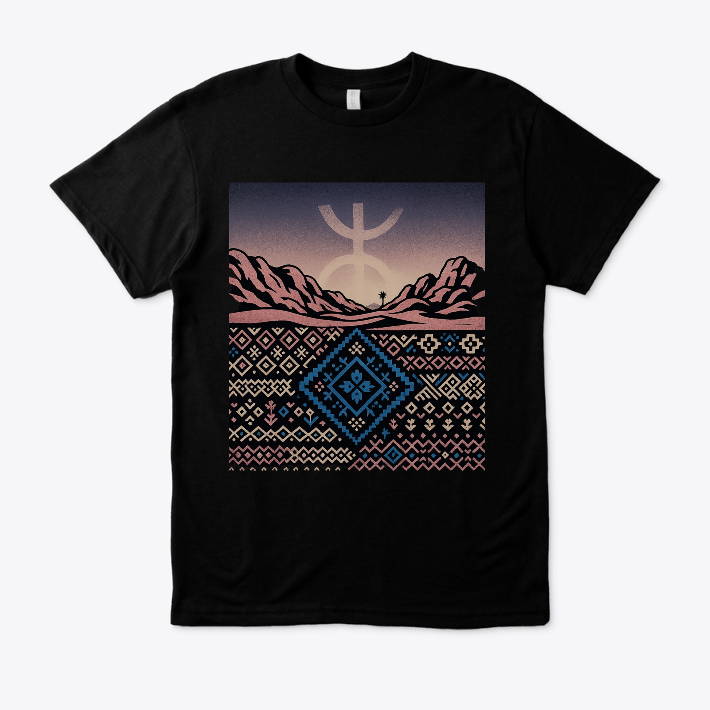 Plus qu’un vêtement, une fresque culturelle. Entre montagnes, symbole amazigh et motifs traditionnels, ce t-shirt raconte une histoire visuelle qui traverse le temps.