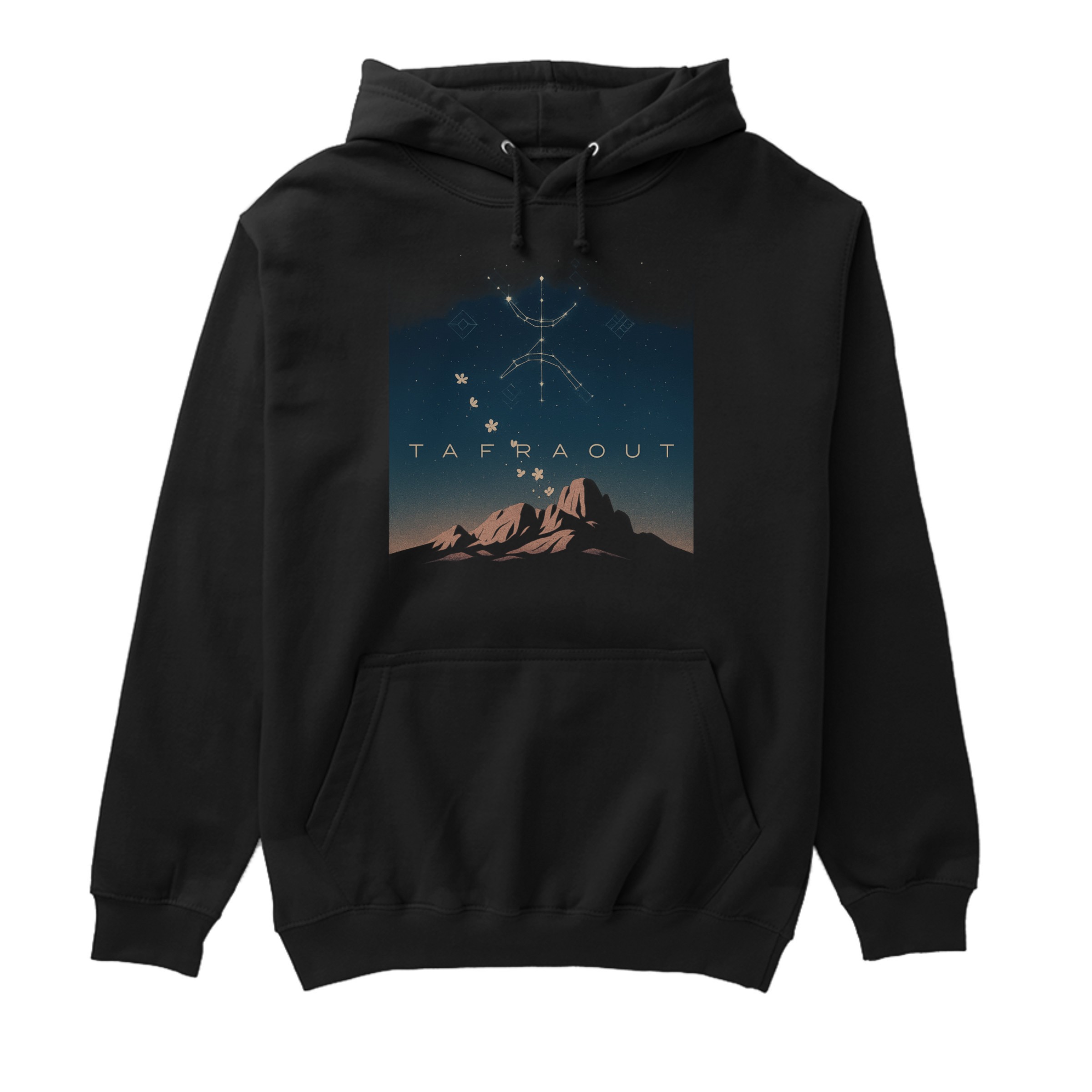 Ce hoodie capture la magie du ciel étoilé de Tafraout. Les constellations en forme du symbole amazigh illuminent la nuit, tandis que les montagnes et les fleurs “timizar” rappellent la beauté intemporelle du Souss.