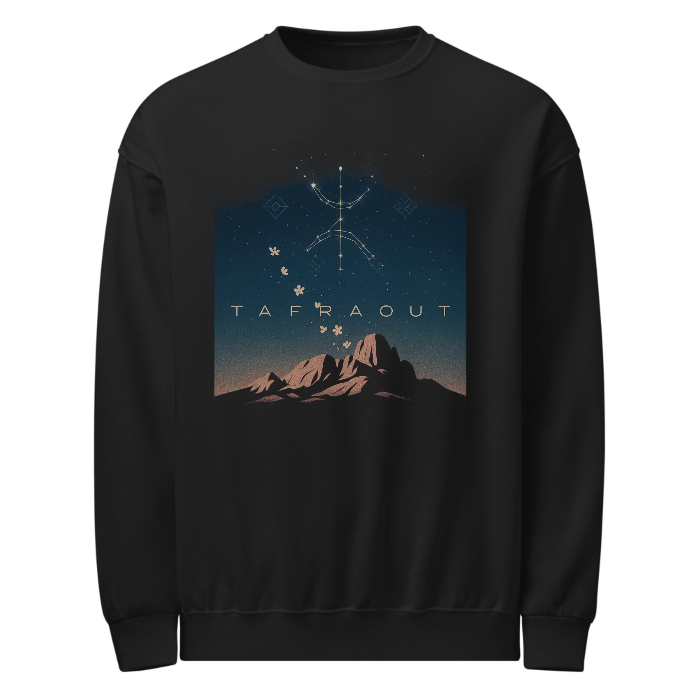 Un sweatshirt qui mêle art, ciel et héritage. Le design met en valeur la constellation amazighe et les paysages rocheux de Tafraout, créant une harmonie entre modernité et tradition.