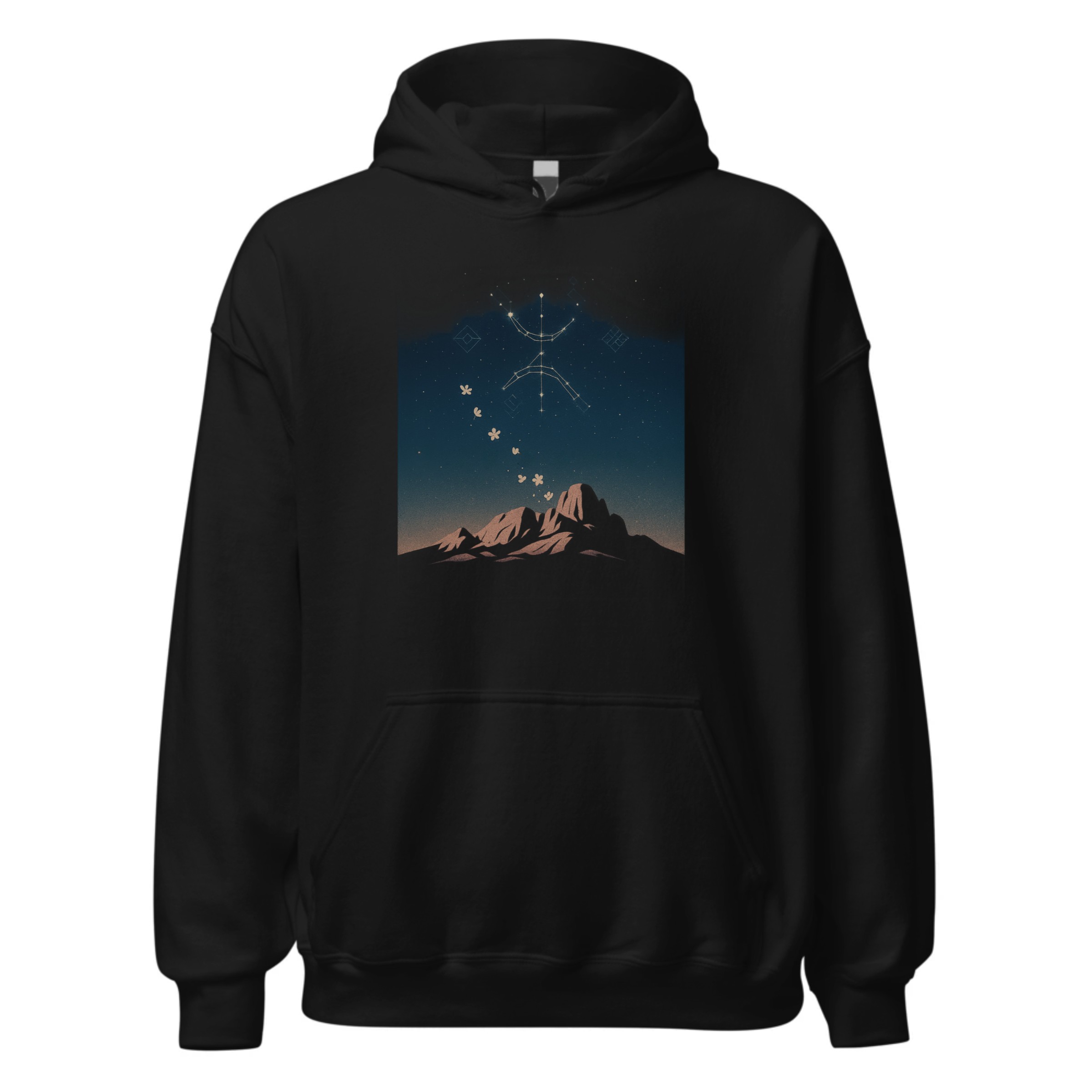 Ce oversize hoodie capture la magie du ciel étoilé de Tafraout. Les constellations en forme du symbole amazigh illuminent la nuit, tandis que les montagnes et les fleurs “timizar” rappellent la beauté intemporelle du Souss.