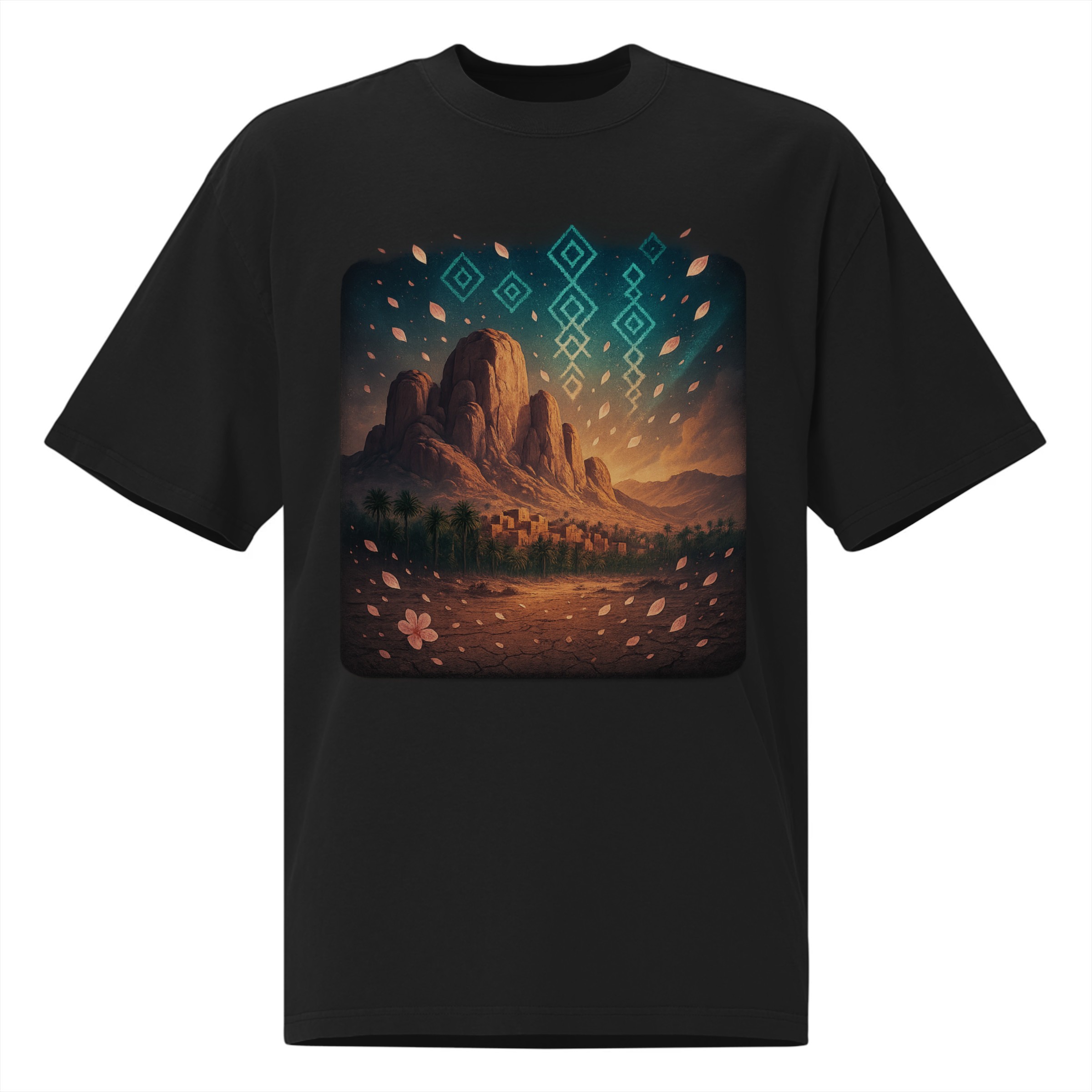 Pensé pour un style streetwear affirmé, ce t-shirt oversize affiche un visuel grandiose et poétique. Entre roche, tradition et symboles amazighs, il s’impose comme une pièce iconique et premium.