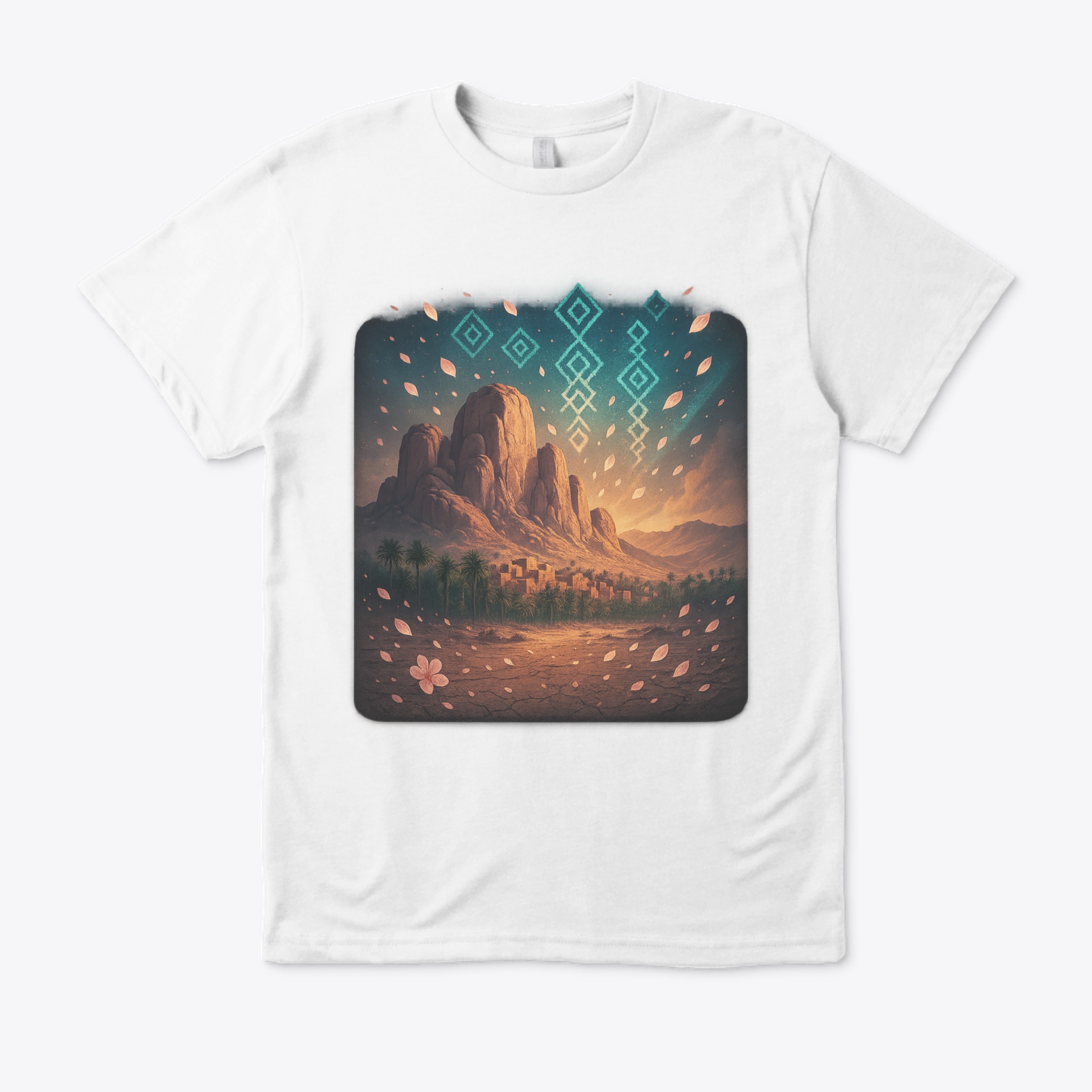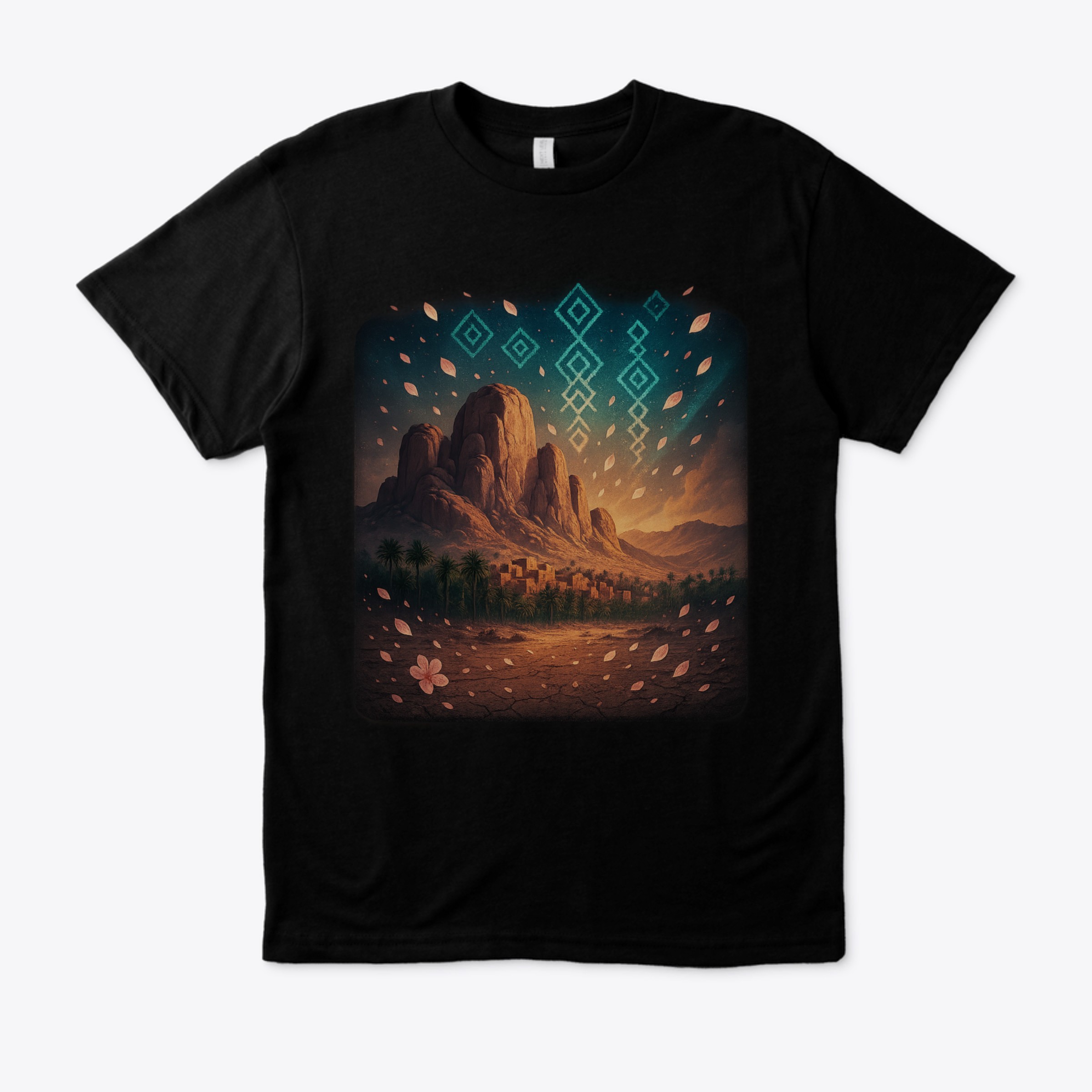 Un t-shirt qui marie force et délicatesse. Les rochers imposants, le village et les pétales “timizar” forment une fresque visuelle qui incarne l’identité de Tafraout.