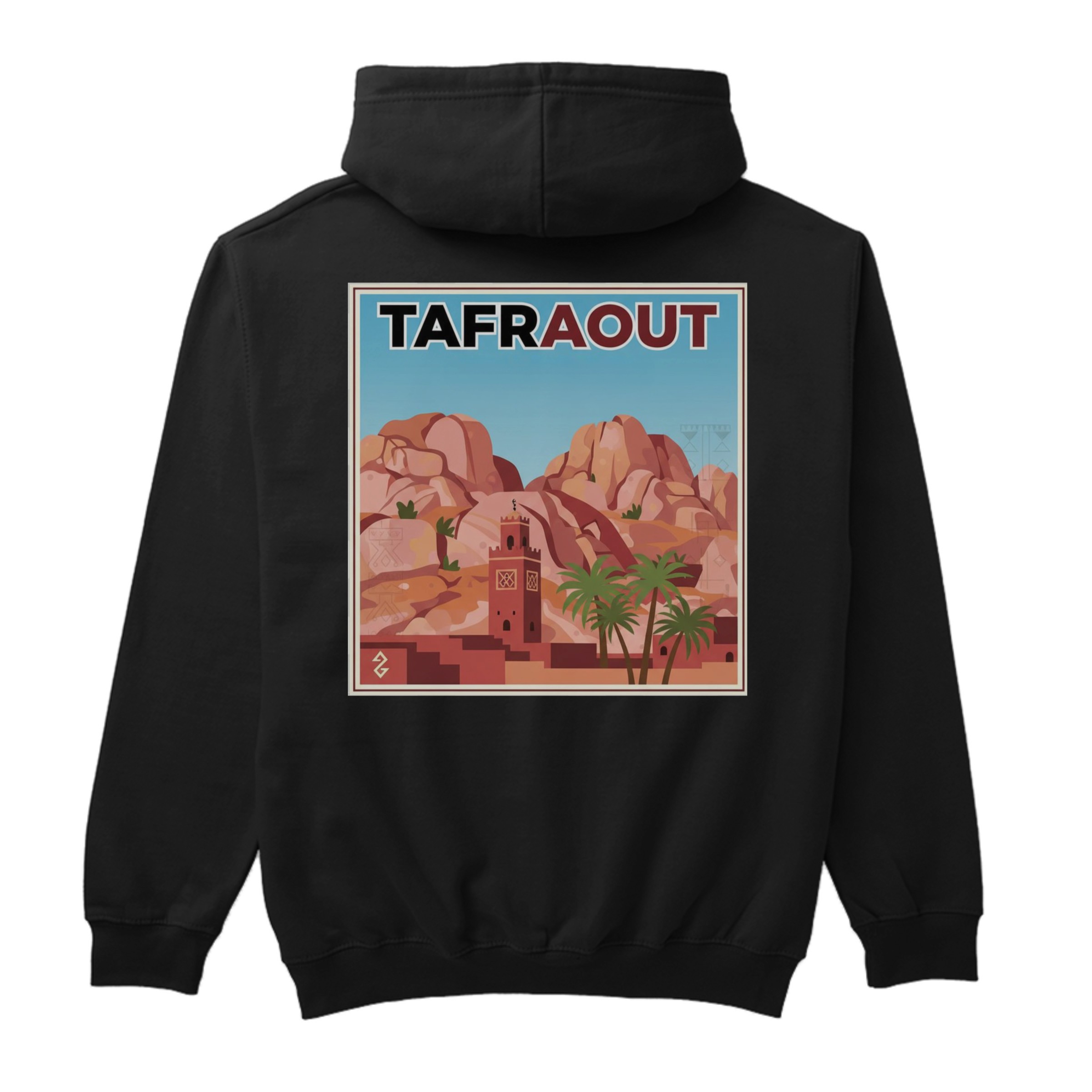 Un hoodie qui capture l’âme de Tafraout : ses roches légendaires, ses palmiers et son architecture unique. Un design moderne qui unit héritage et style urbain.