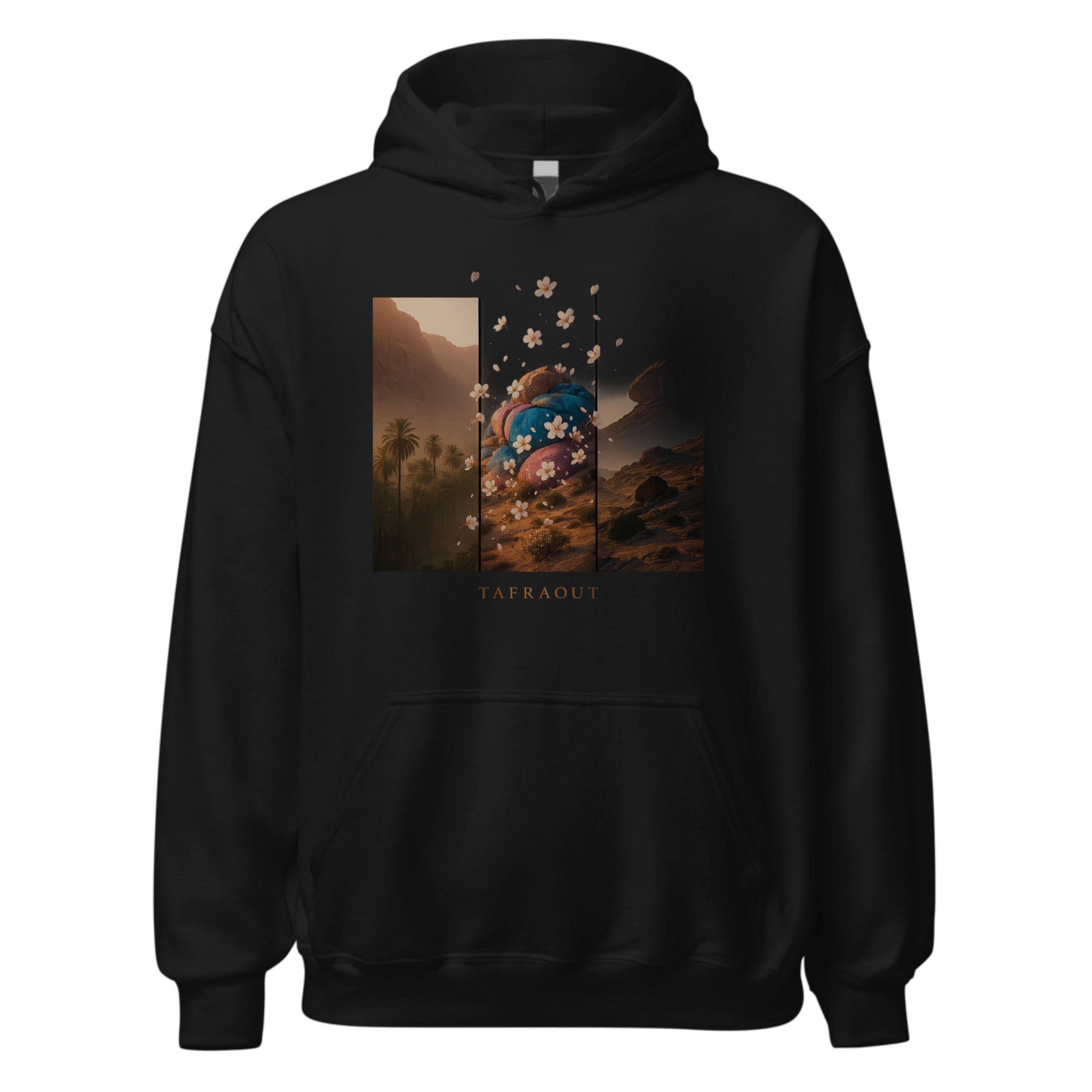 Hoodie oversize mixte 320 g en coton doux (80 % coton, 20 % polyester). Coupe ample streetwear, design Tafraout (montagnes, symboles amazighs, fleurs d’amandier). Poche kangourou et capuche ajustable. Finitions premium (molleton invisible, coutures renforcées). Une pièce qui affirme vos racines et votre style.