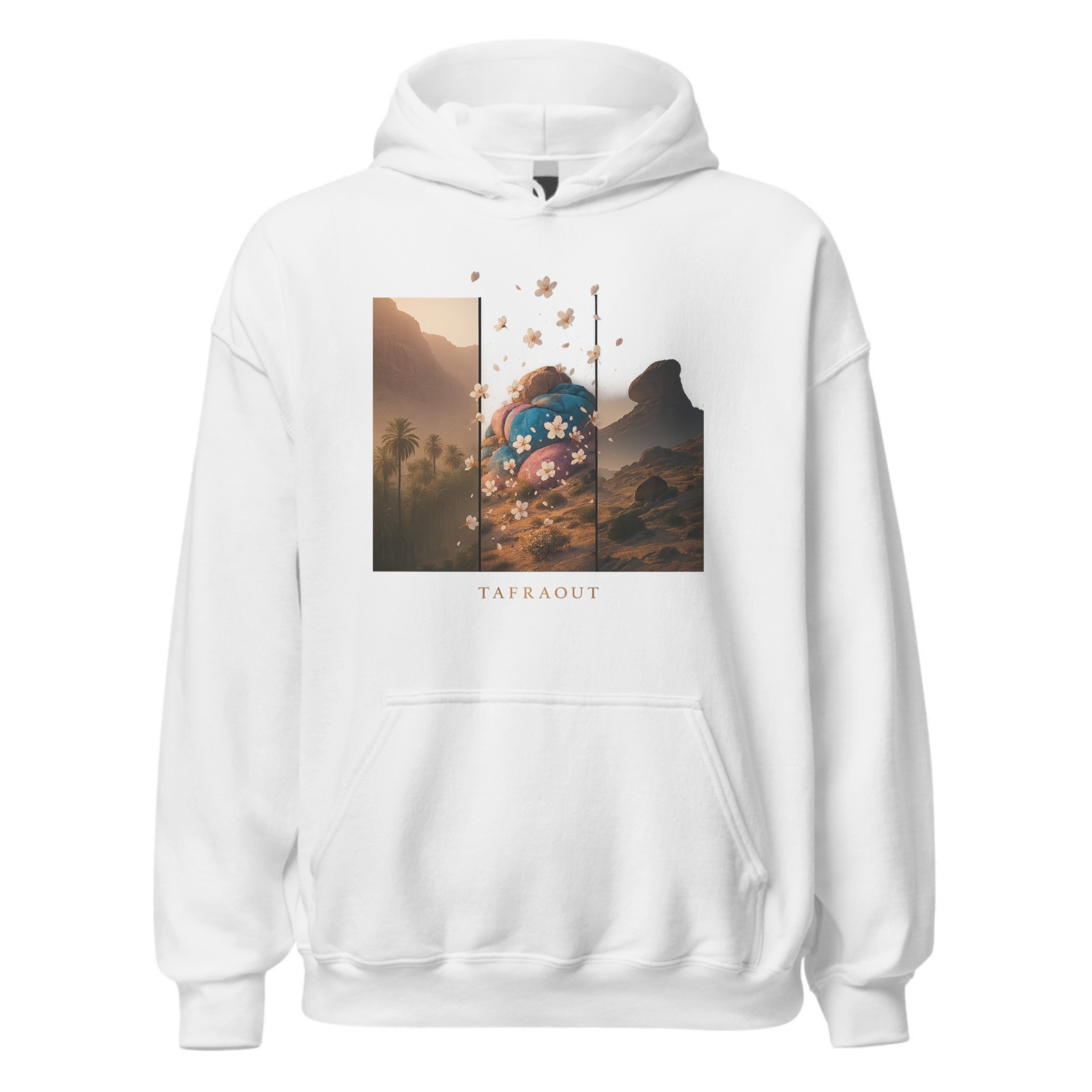 Hoodie oversize mixte 320 g en coton doux (80 % coton, 20 % polyester). Coupe ample streetwear, design Tafraout (montagnes, symboles amazighs, fleurs d’amandier). Poche kangourou et capuche ajustable. Finitions premium (molleton invisible, coutures renforcées). Une pièce qui affirme vos racines et votre style.
