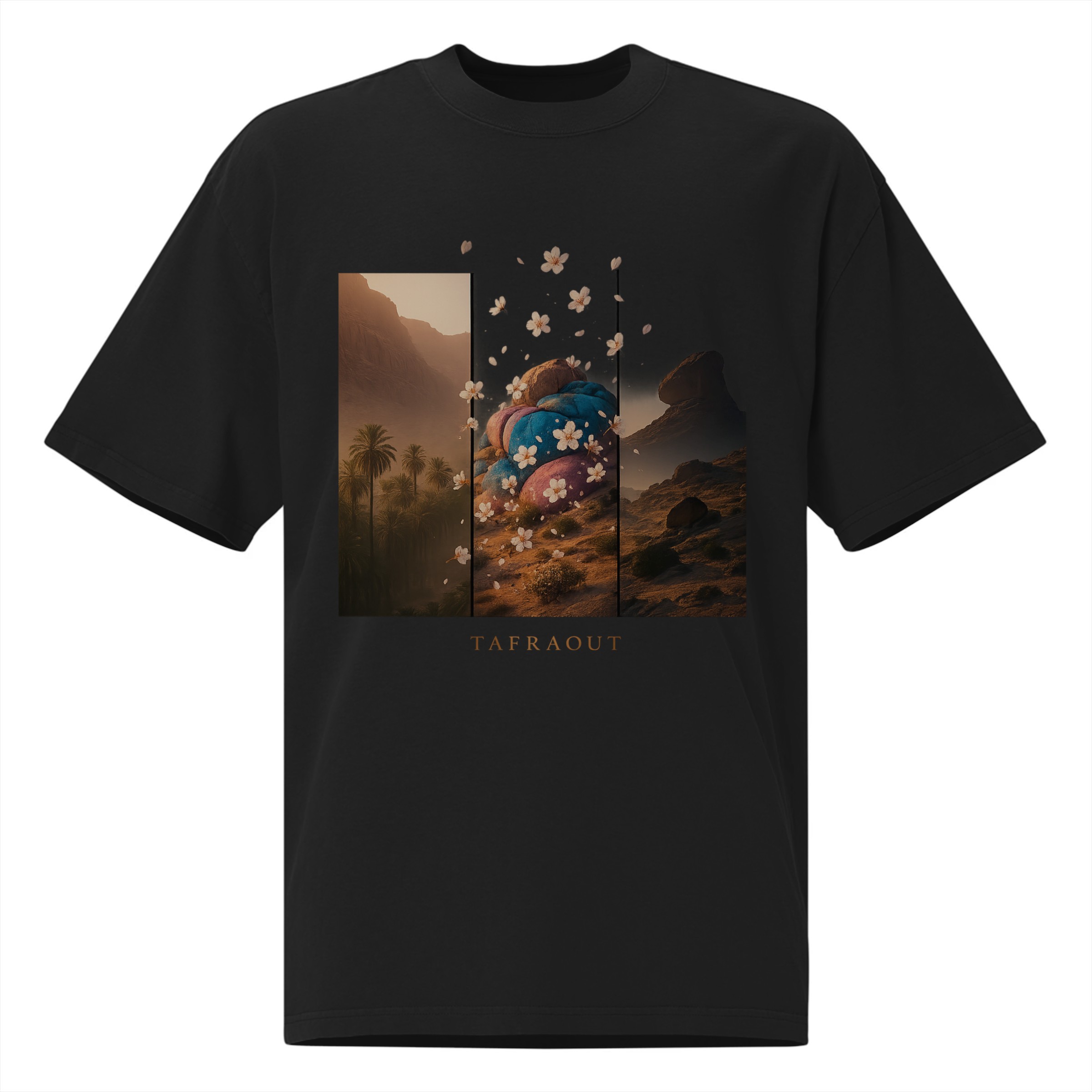 Pensé pour un look streetwear affirmé, ce t-shirt oversize reprend l’iconique paysage des rochers peints de Tafraout dans une version artistique et moderne.