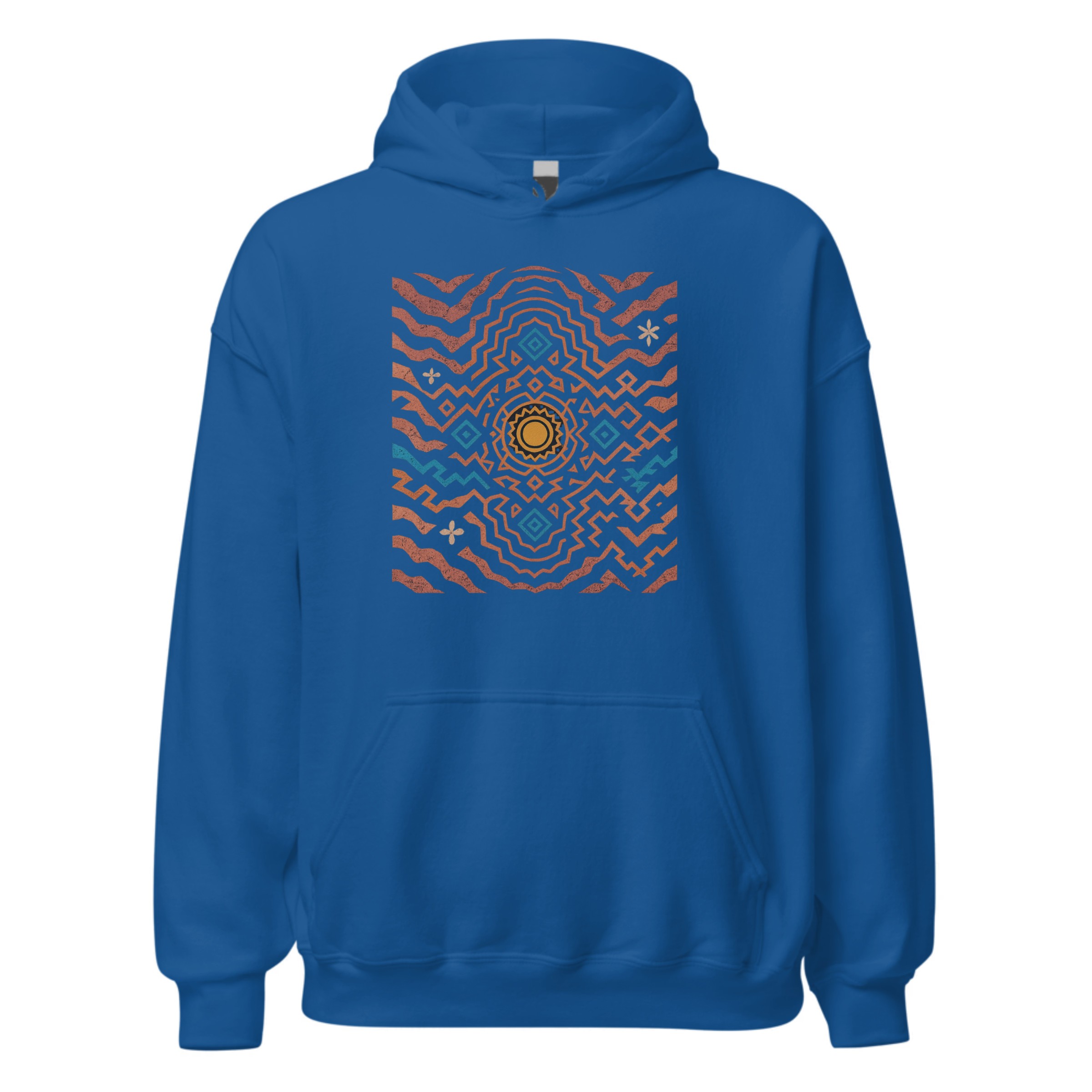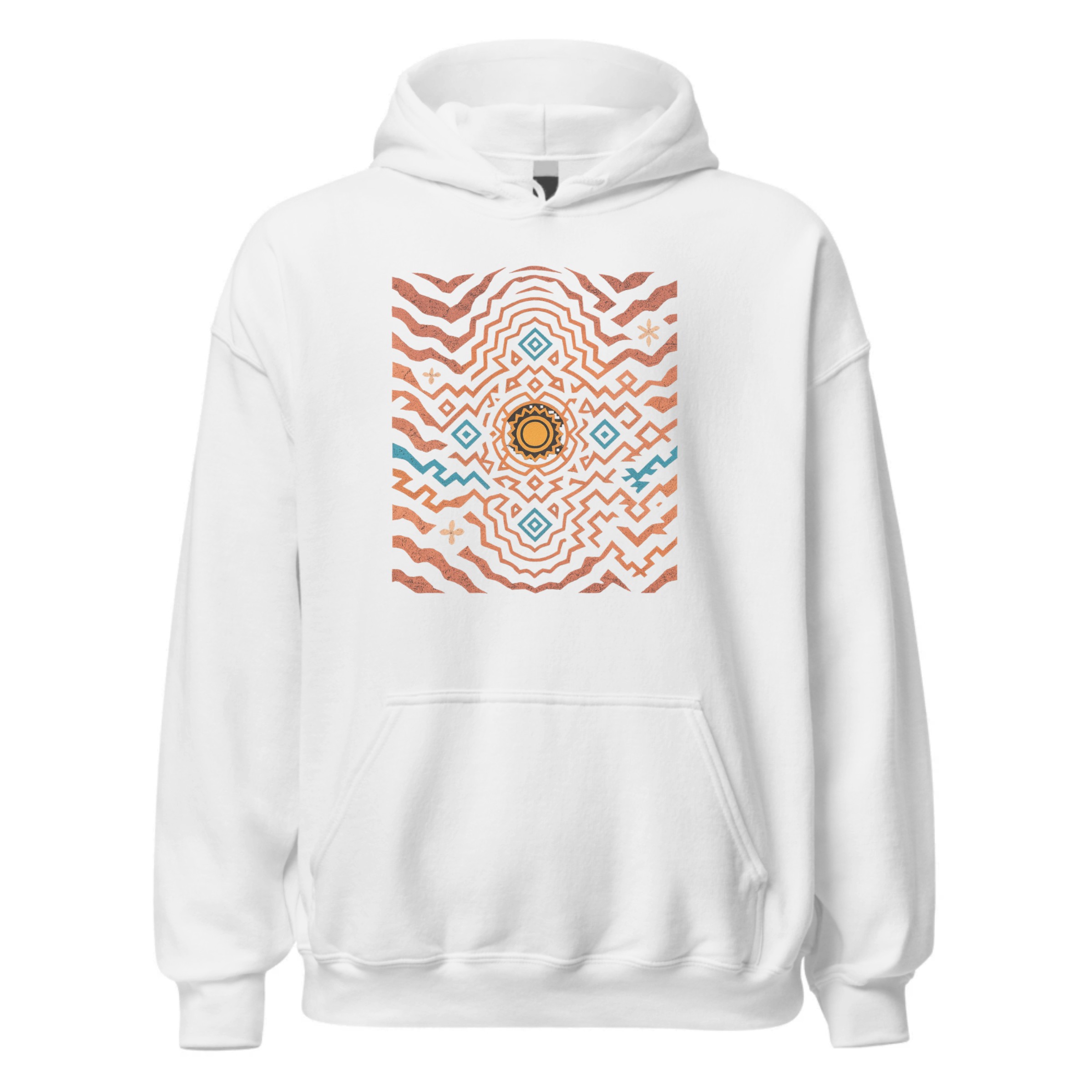 Ce oversize hoodie incarne la force du soleil “tufukt”, source de vie dans le désert. Les motifs amazighs géométriques entourent l’astre central dans un design vibrant, symbole d’énergie et d’identité.