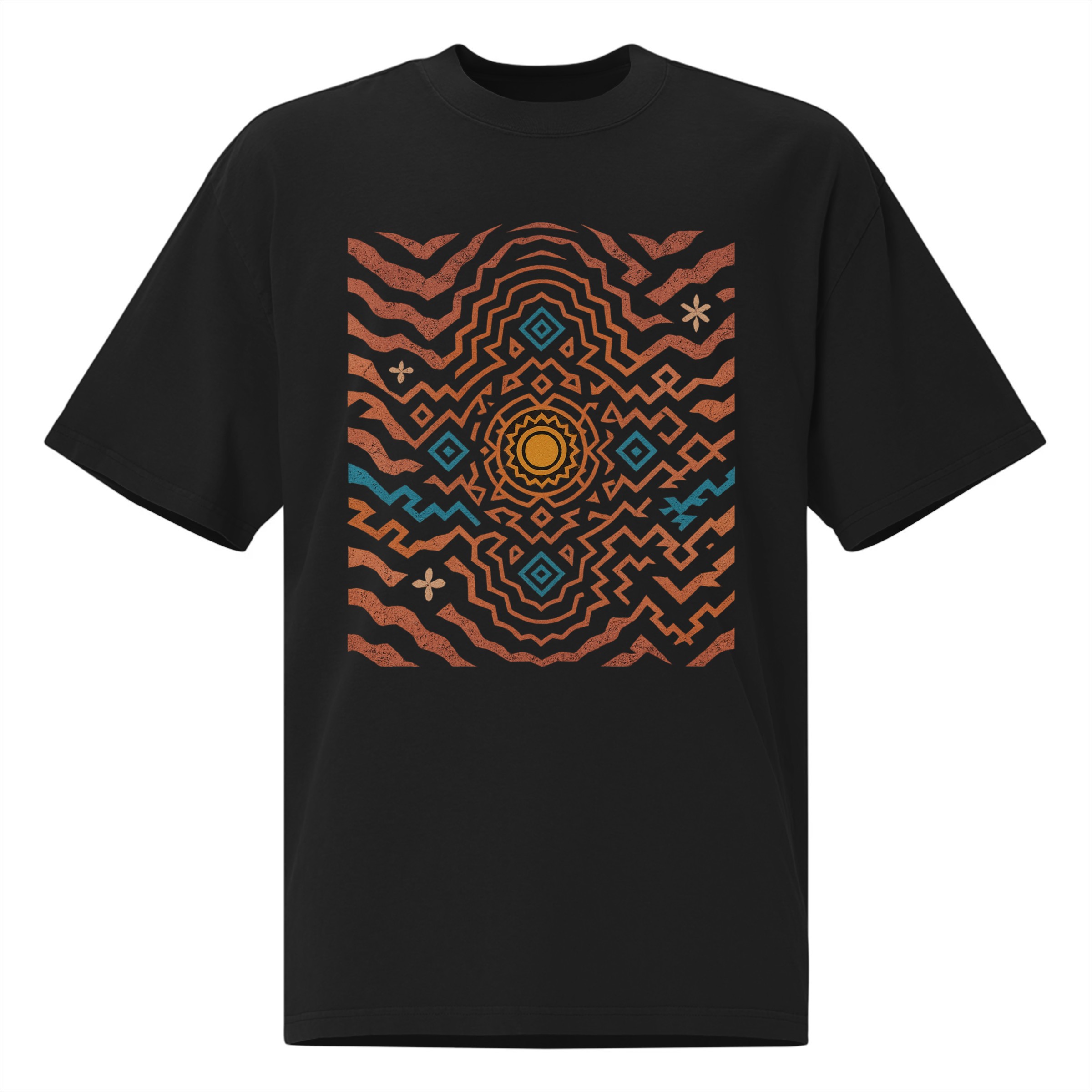 Pensé pour un look streetwear solaire, ce t-shirt oversize combine modernité et tradition. Le soleil amazigh rayonne au cœur du design, entouré de motifs géométriques, pour une pièce unique et expressive.