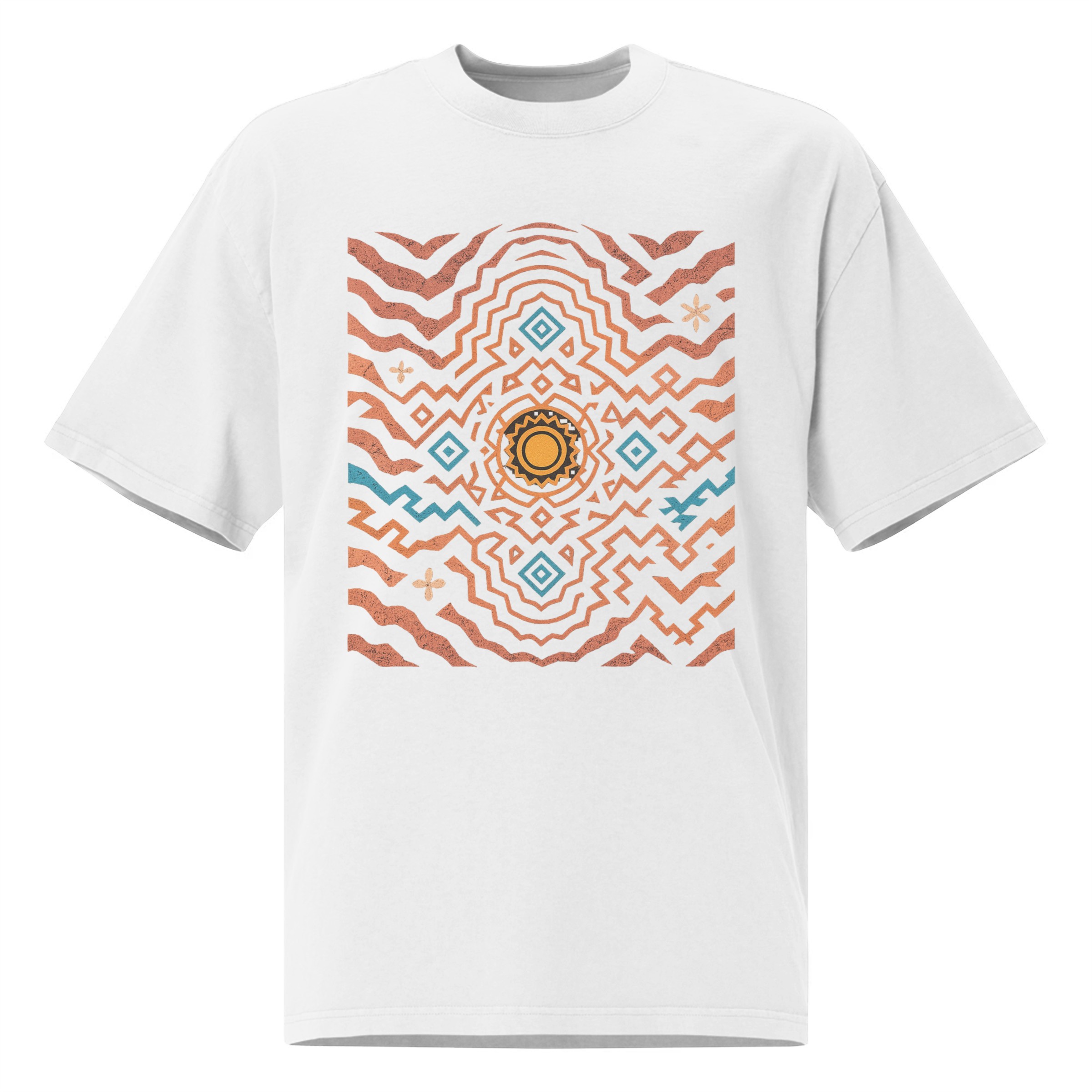 Pensé pour un look streetwear solaire, ce t-shirt oversize combine modernité et tradition. Le soleil amazigh rayonne au cœur du design, entouré de motifs géométriques, pour une pièce unique et expressive.