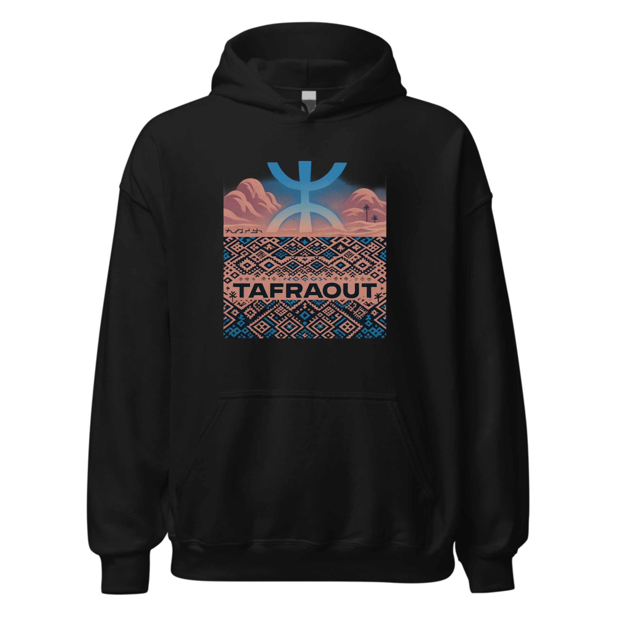 Hoodie oversize mixte 320 g en coton doux (80 % coton, 20 % polyester). Coupe ample streetwear, design Tafraout (montagnes, symboles amazighs, fleurs d’amandier). Poche kangourou et capuche ajustable. Finitions premium (molleton invisible, coutures renforcées). Une pièce qui affirme vos racines et votre style.