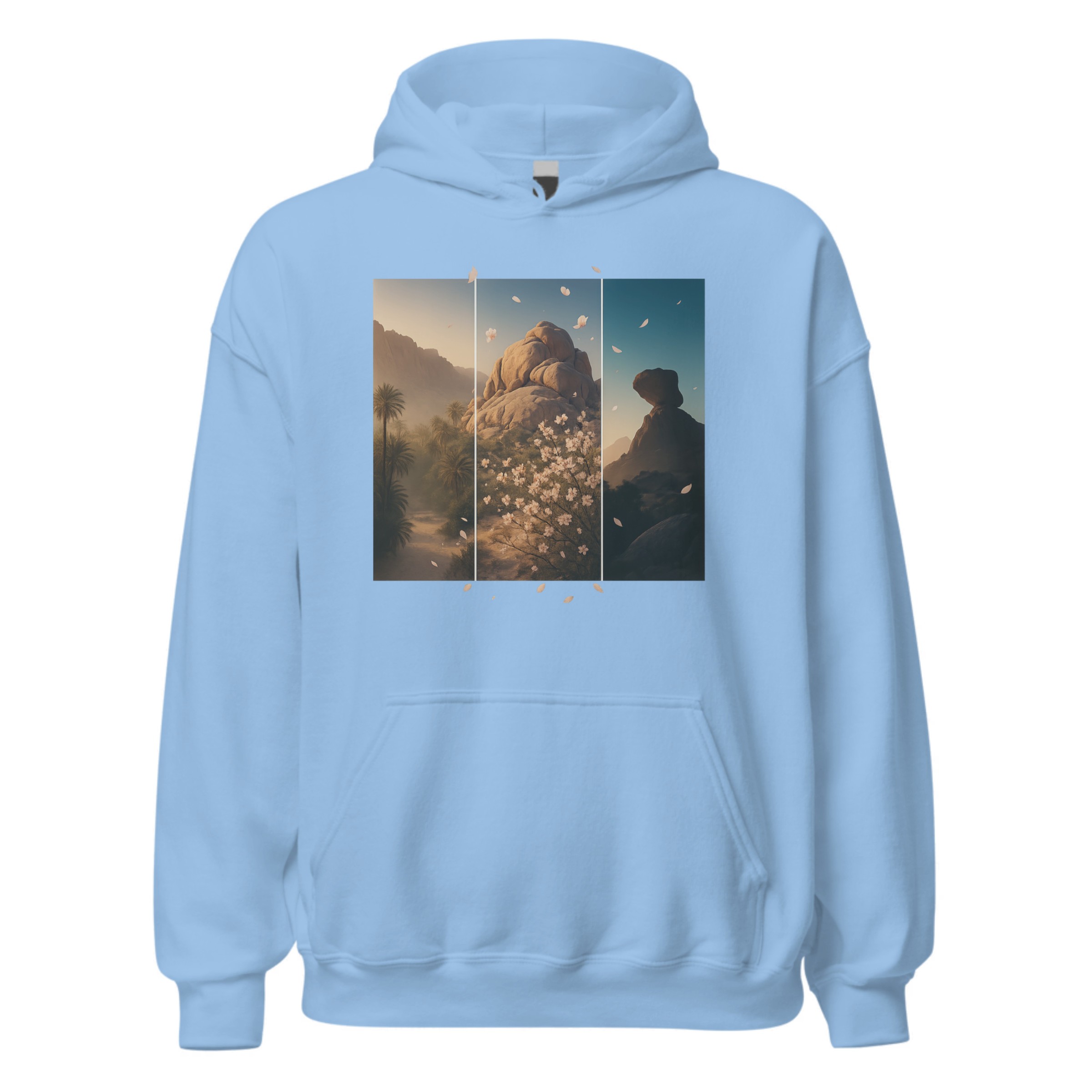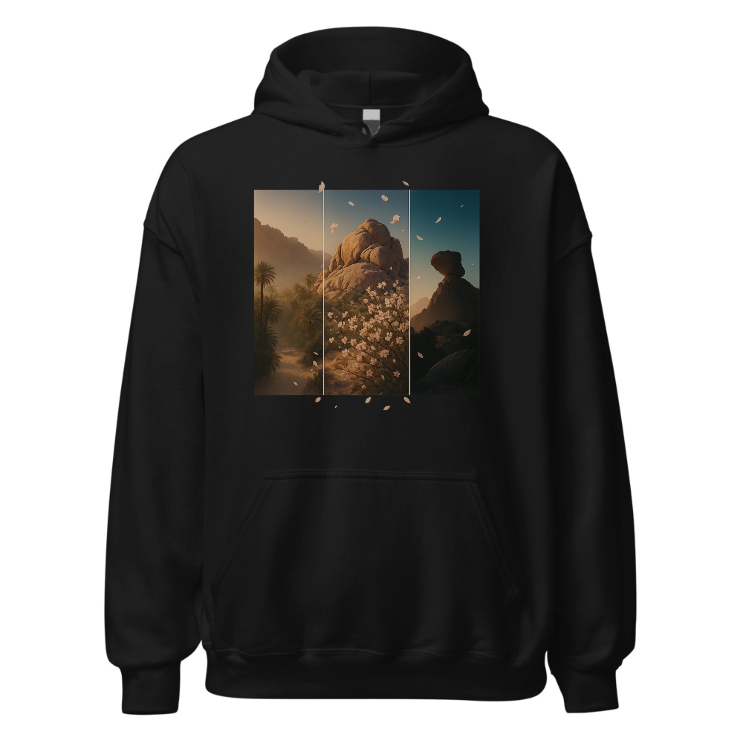 Un overize hoodie qui raconte l’histoire de Tafraout. Entre rochers, palmiers et fleurs “timizar”, ce design en triptyque capture la beauté brute et poétique du Souss.