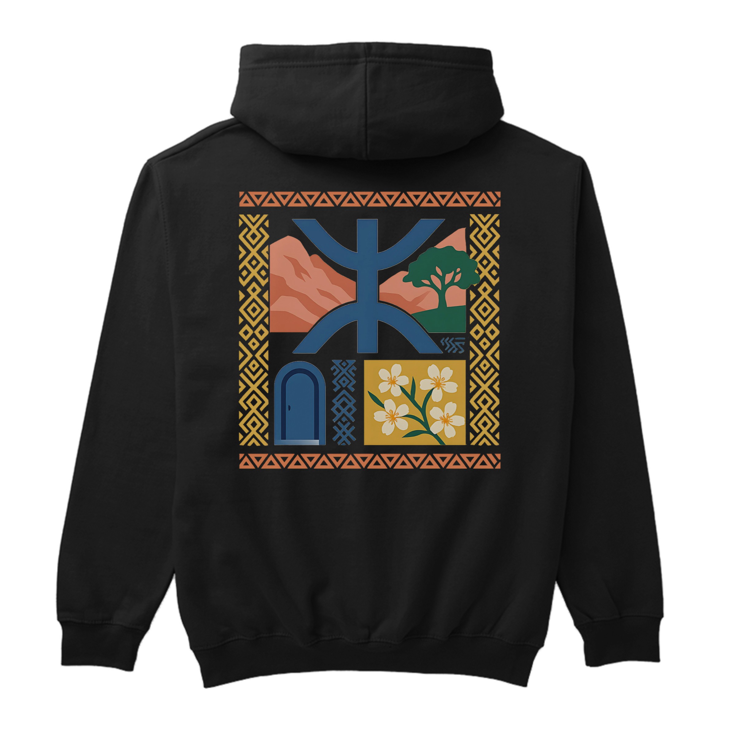 Un hoodie pensé pour les esprits fiers de leurs origines. Le grand motif dans le dos raconte l’histoire de Tafraout : les montagnes “adrar”, les fleurs d’amandier “timizar” et le symbole amazigh qui unit tradition et modernité. À l’avant, un discret rappel du motif apporte équilibre et élégance.