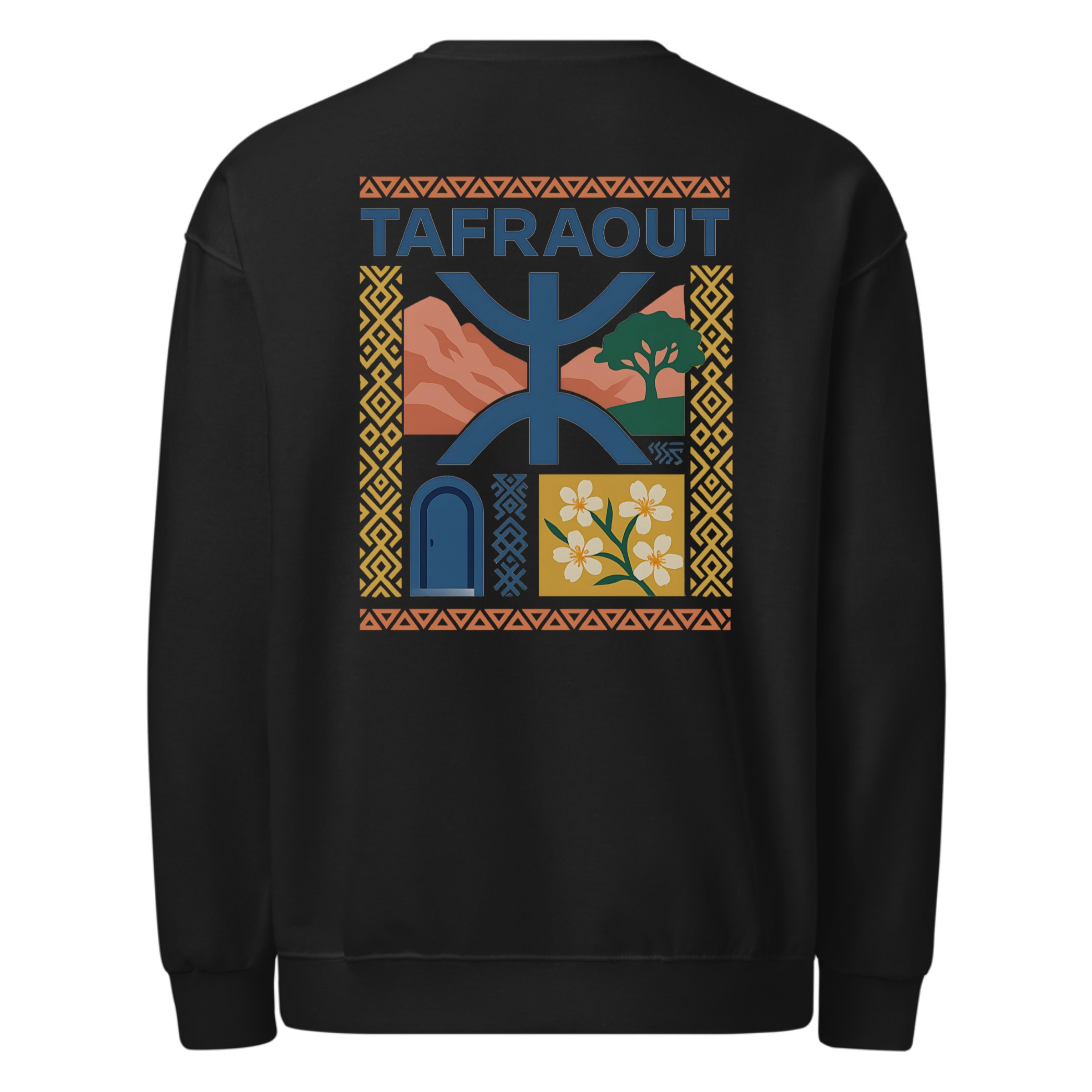 Ce sweatshirt célèbre l’essence de Tafraout avec un design vibrant qui marie art amazigh et authenticité. À l’arrière, une fresque inspirée des paysages et des symboles berbères, et à l’avant, un motif subtil pour rappeler votre héritage “amazigh”.