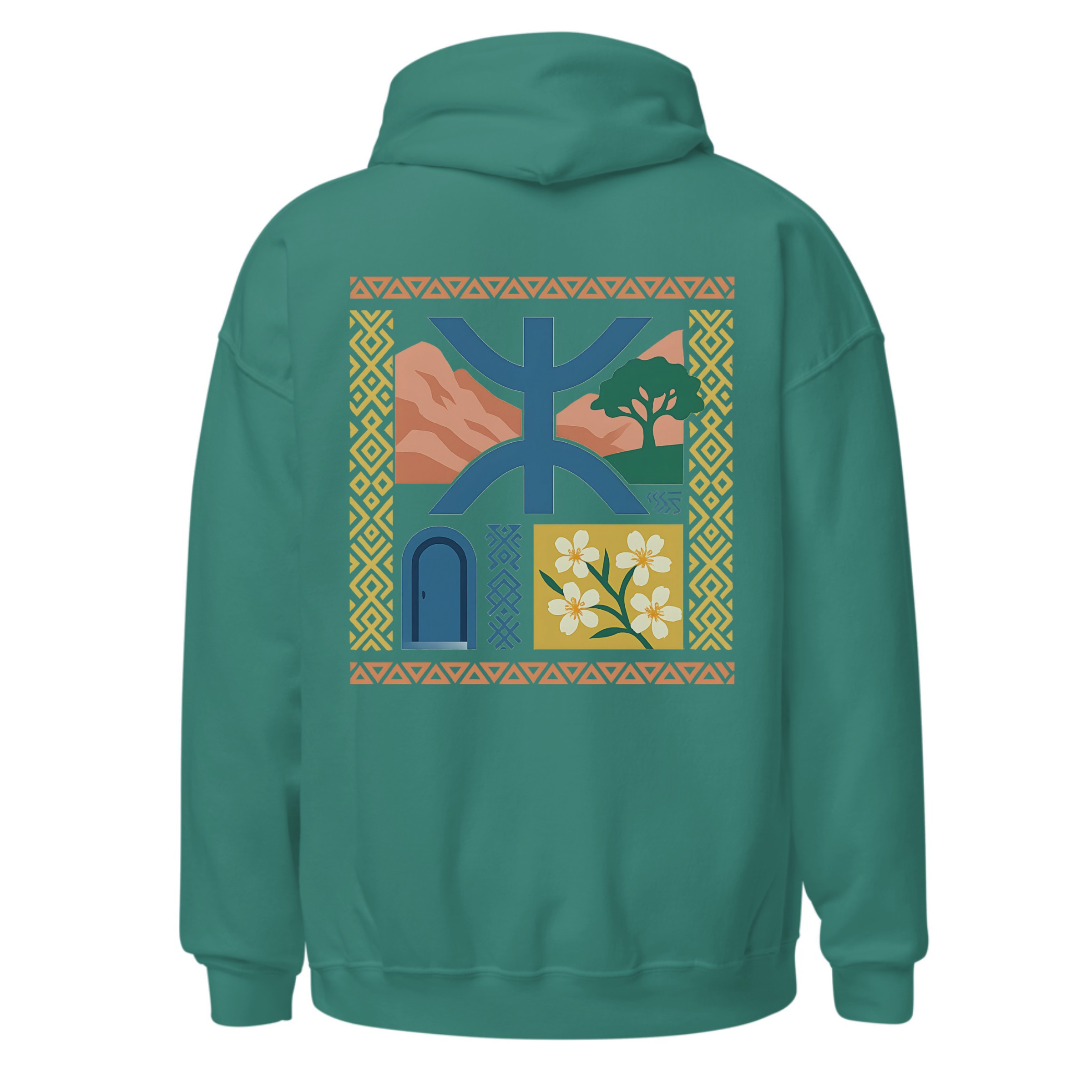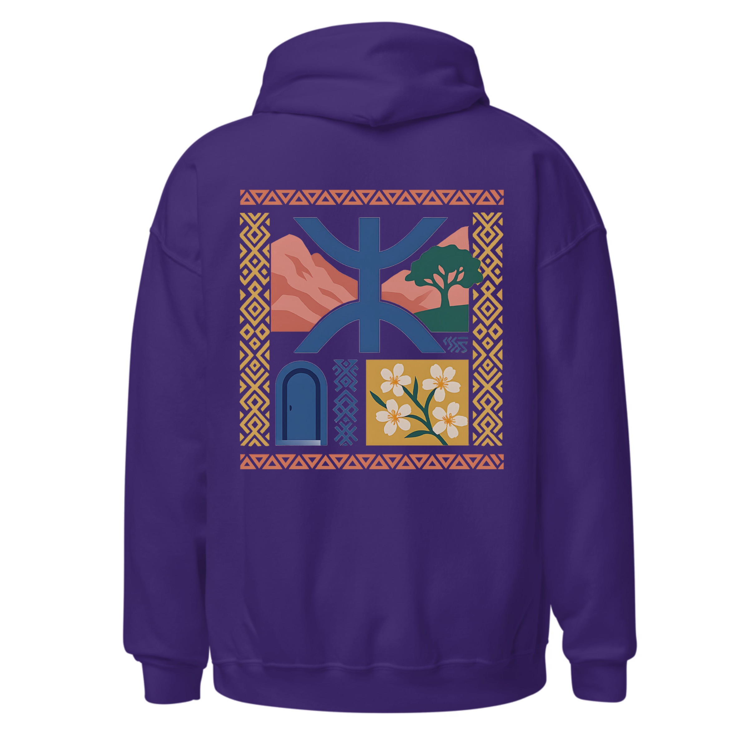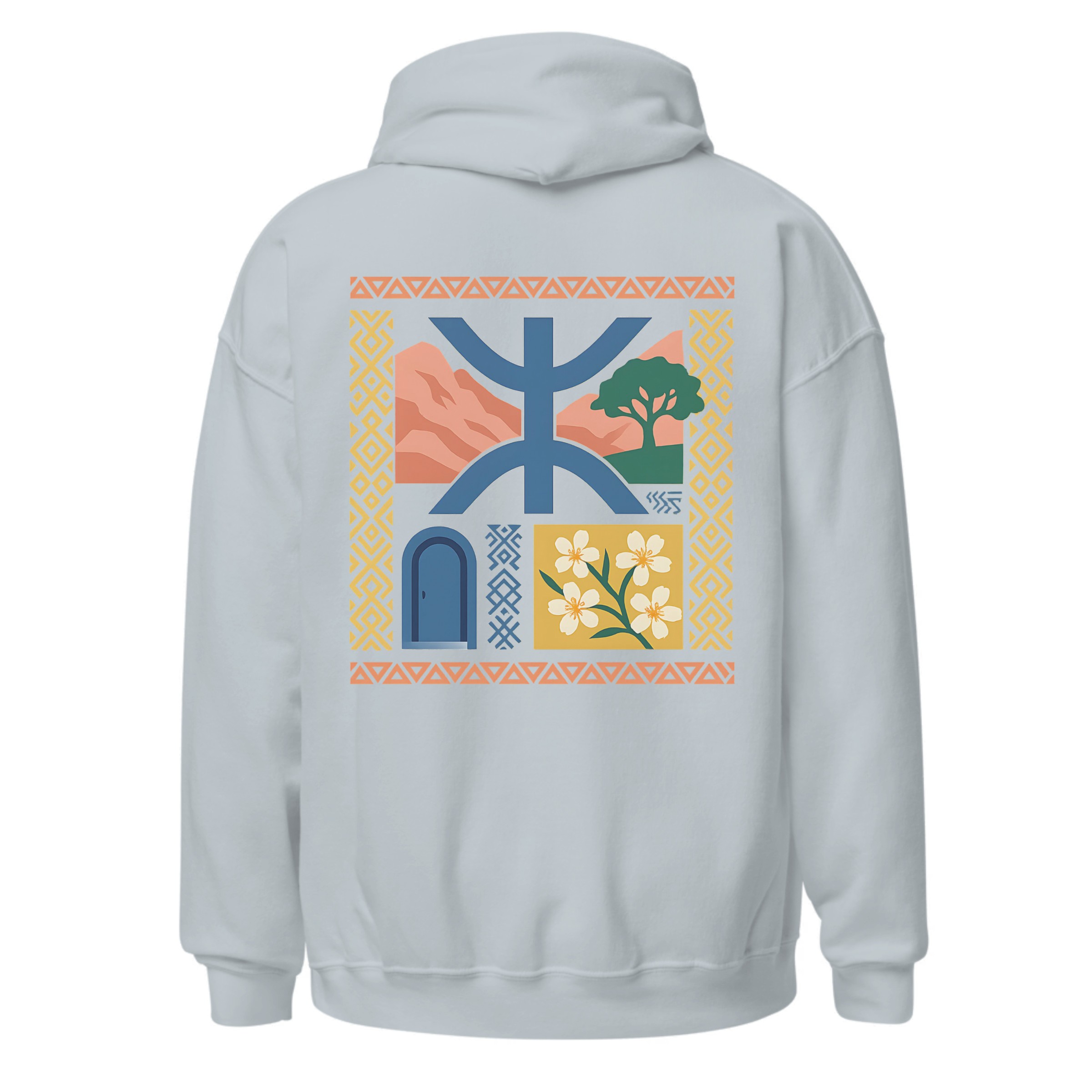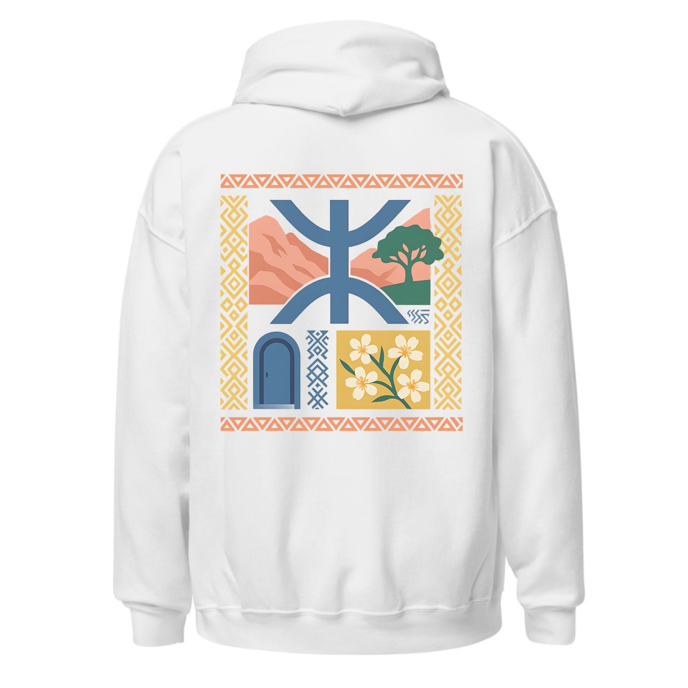 Hoodie oversize mixte 320 g en coton doux (80 % coton, 20 % polyester). Coupe ample streetwear, design Tafraout (montagnes, symboles amazighs, fleurs d’amandier). Poche kangourou et capuche ajustable. Finitions premium (molleton invisible, coutures renforcées). Une pièce qui affirme vos racines et votre style.