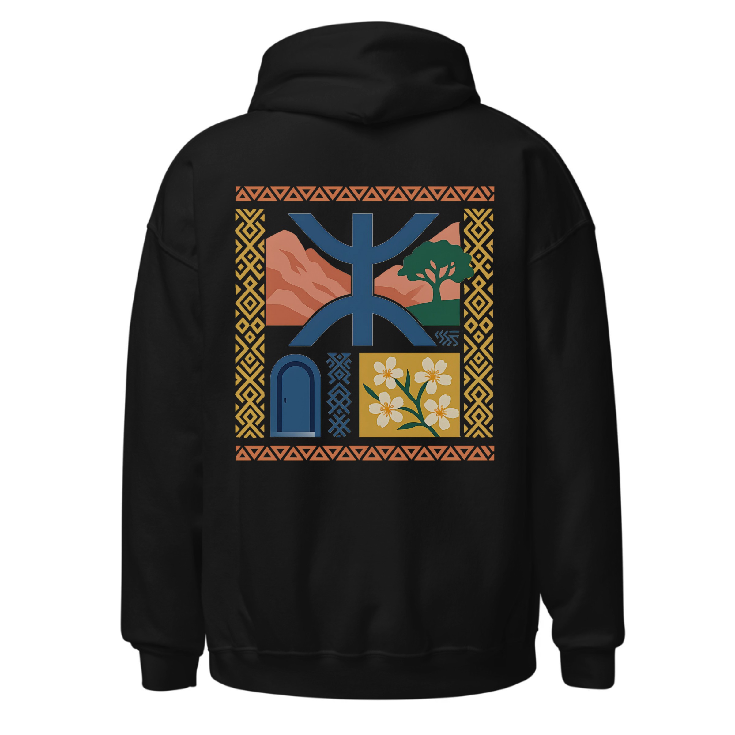 Un oversize hoodie pensé pour les esprits fiers de leurs origines. Le grand motif dans le dos raconte l’histoire de Tafraout : les montagnes “adrar”, les fleurs d’amandier “timizar” et le symbole amazigh qui unit tradition et modernité. À l’avant, un discret rappel du motif apporte équilibre et élégance.