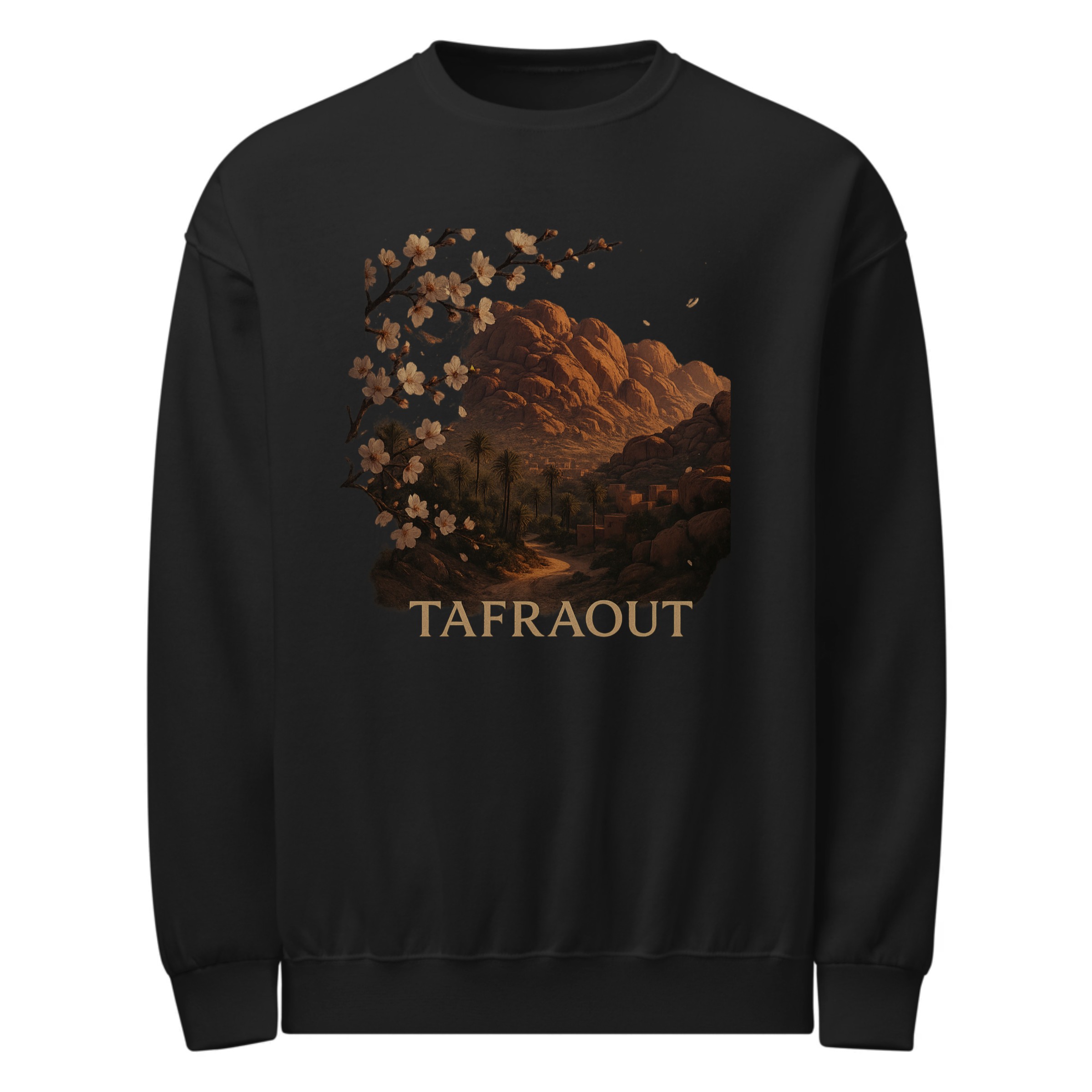 Ce sweatshirt rend hommage à Tafraout : une vallée entre rochers et palmiers, illuminée par la floraison des amandiers.